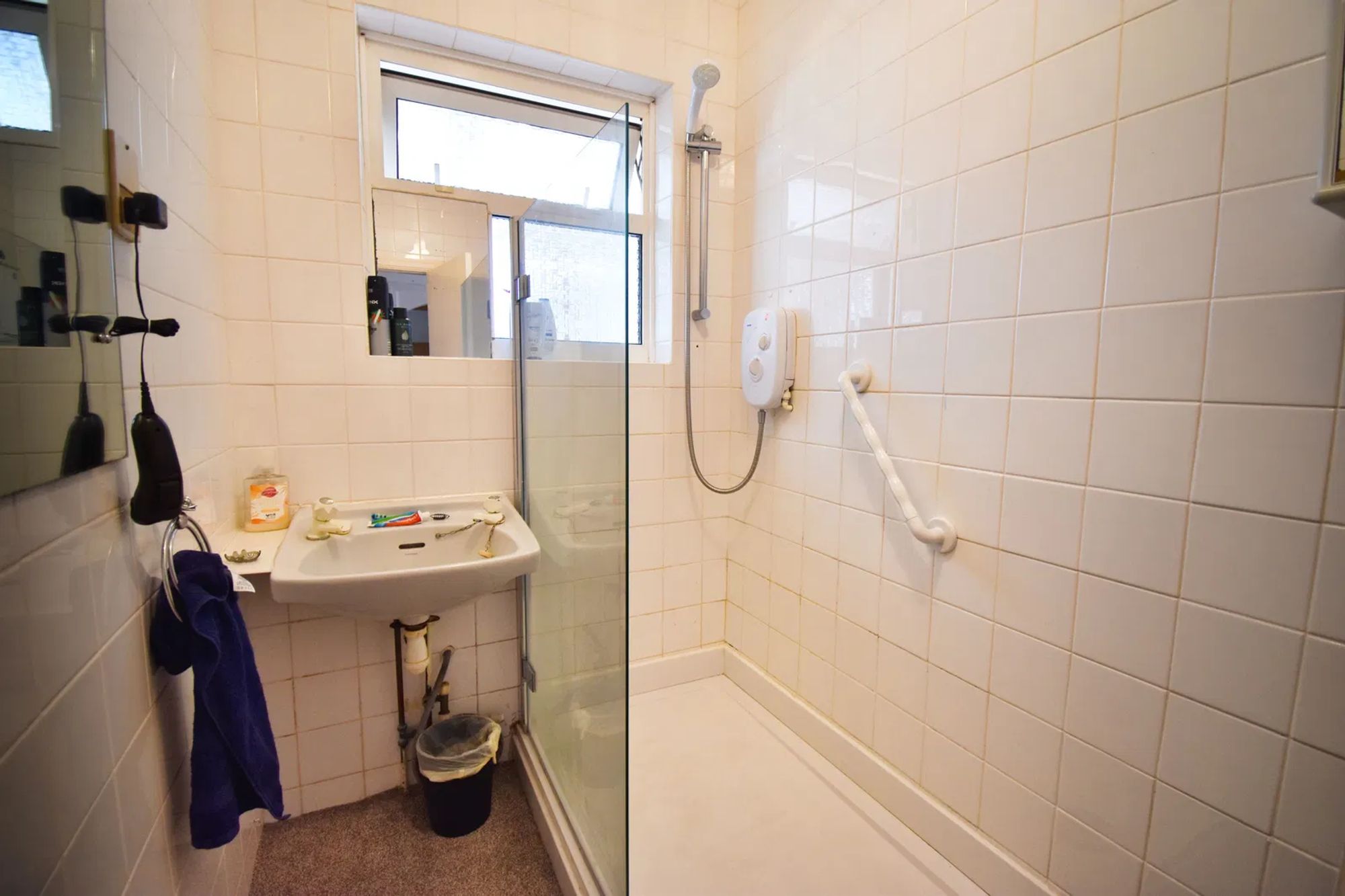 Frosted window to the front. Electric shower in walk in enclosure. Wash hand basin. Fully tiled walls.