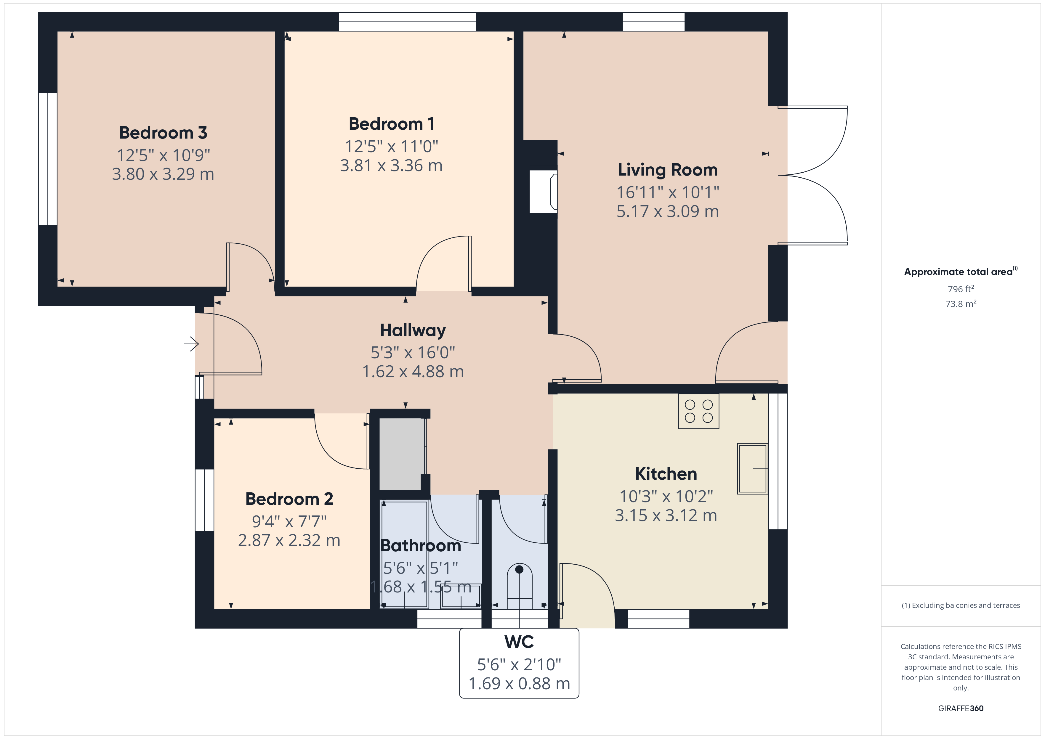 WC 5' 7" x 2' 11" (1.69m x 0.88m)