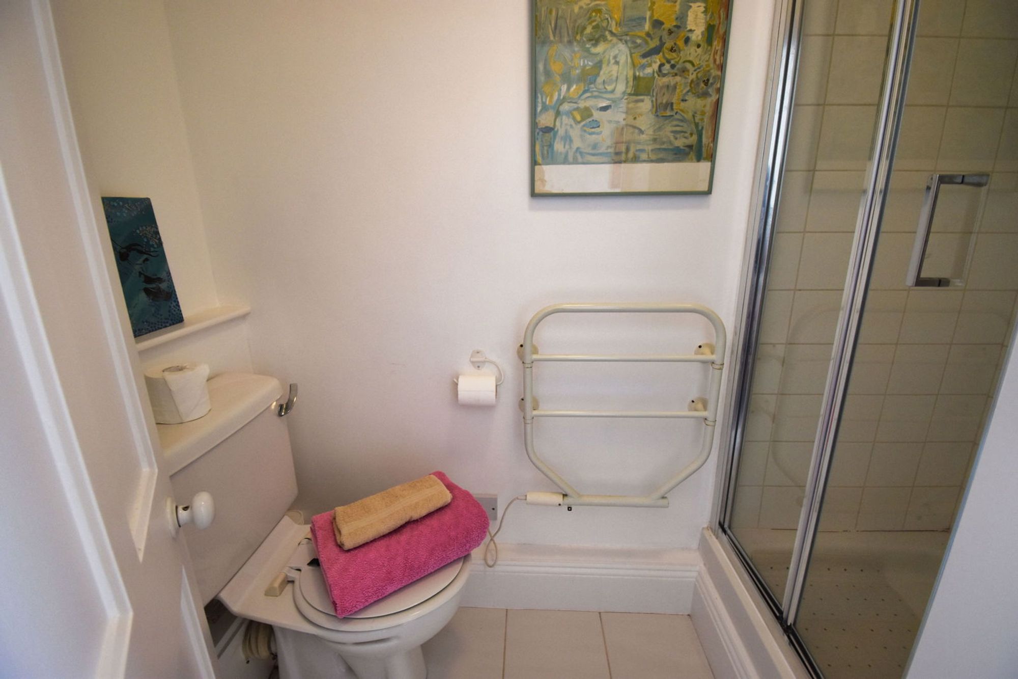Mains shower within glazed enclosure. Matching WC and wash-hand basin. Heated towel rail. Partly tiled walls and tiled floor.