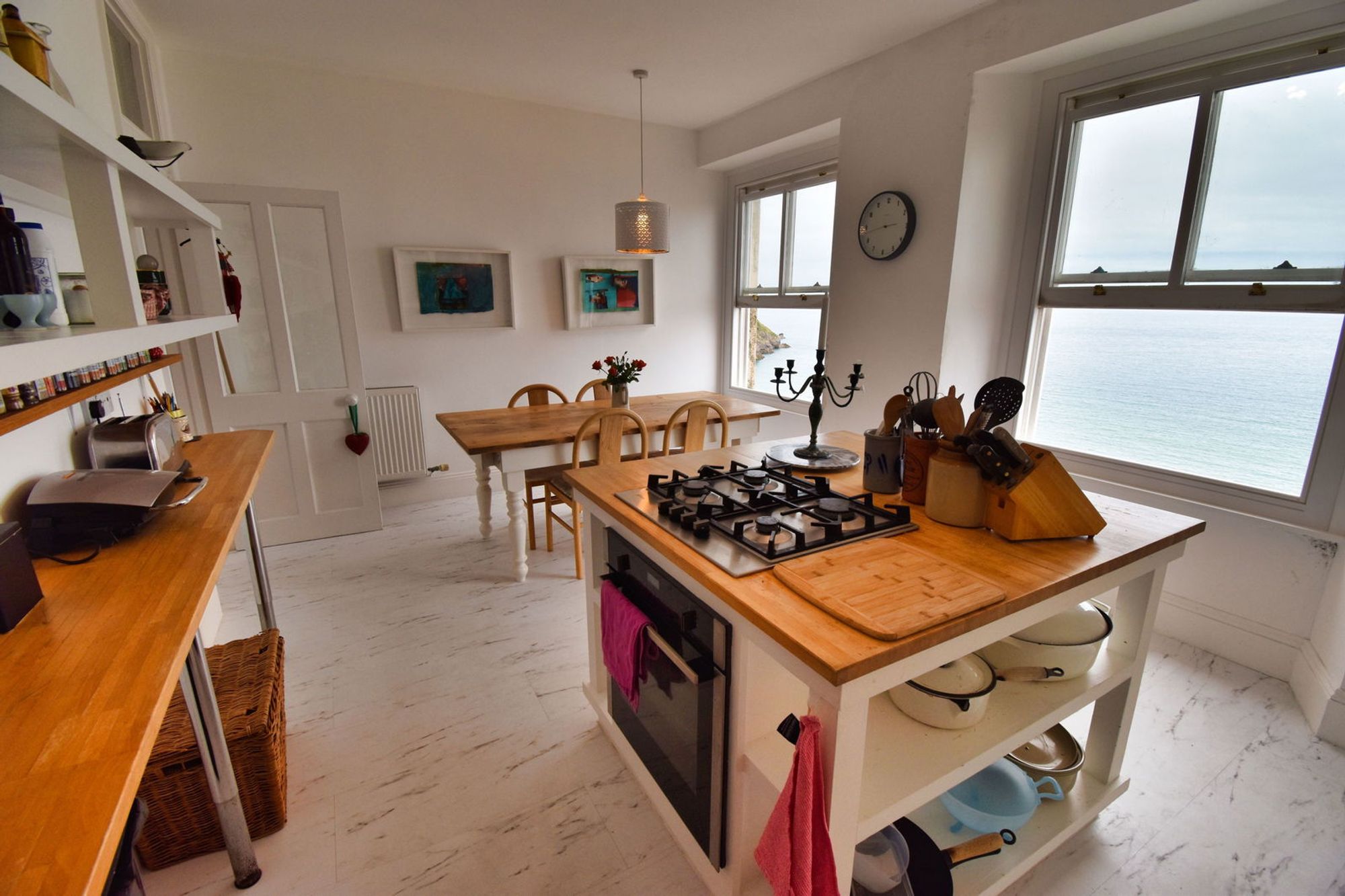 Two timber framed double glazed sash windows to the front, with ocean views. Fitted kitchen with a range of matching wall and base units and a solid Oak worktop, with corresponding island unit with integral four ring Neff gas hob. Integral eye level electric oven. Space and connection for upright fridge freezer and dishwasher. Inset 1.5 stainless steel sink and drainer. Ample space for family sized dining suite. Part tiled walls. Vinyl floor tiles.