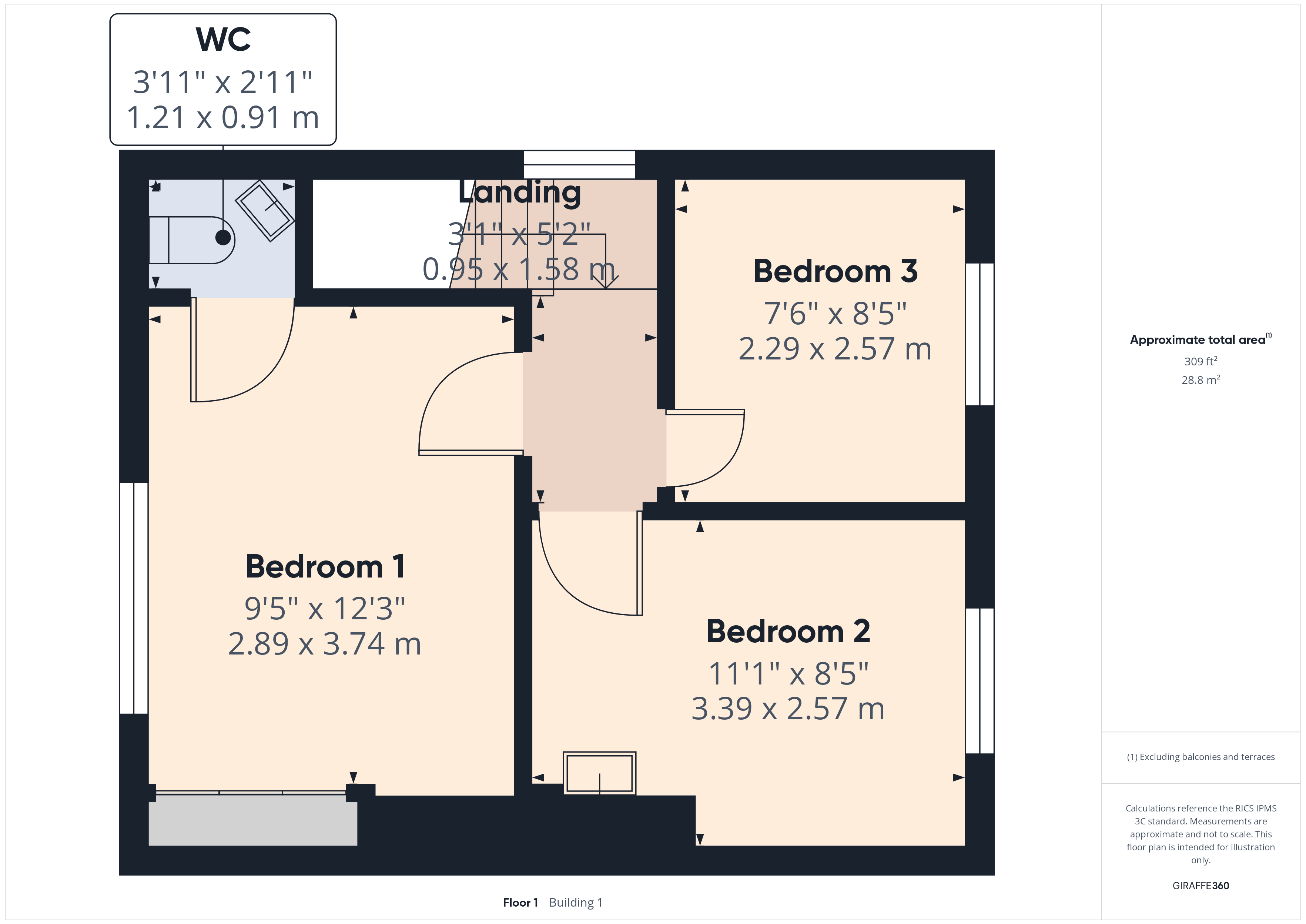 Bedroom 1 12' 3" x 9' 6" (3.74m x 2.89m)
