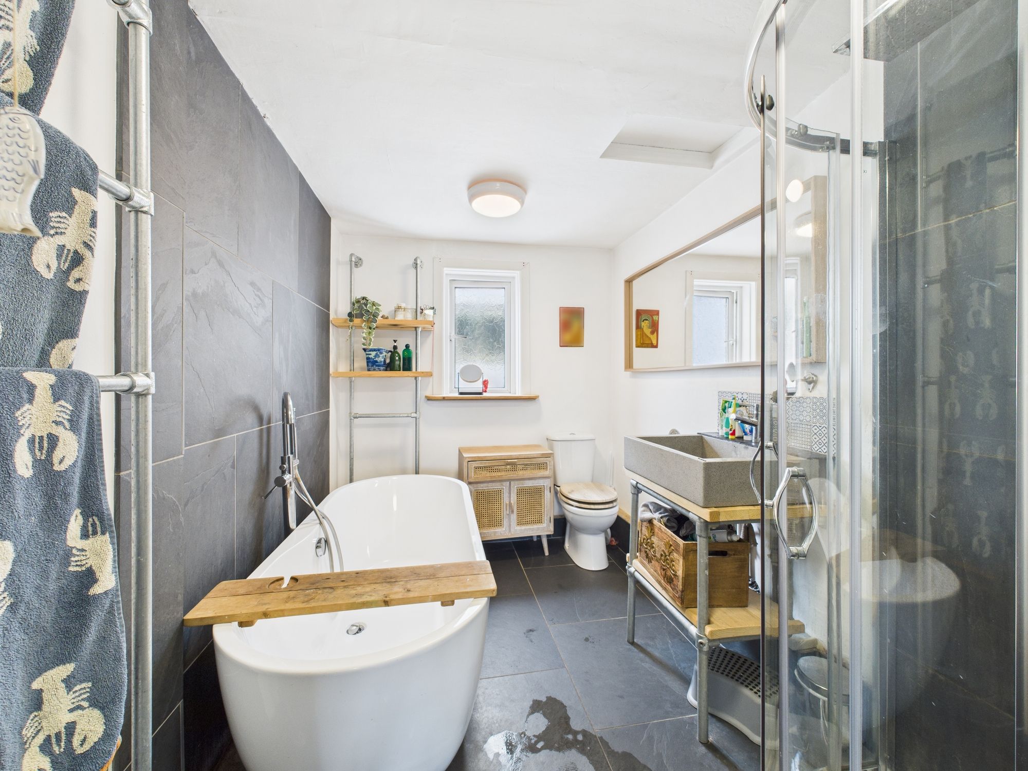 Entering via the hallway there is a doorway to the right which leads to charming kitchen dining room with large window to the fore capturing the breathtaking coastal views to the fore and allowing natural light to flow through the room. An opening to the rear leads to cosy lounge area with wood burning stove, French doors out to the rear garden and adjoining the large ground floor bathroom complete with roll top bath and walk-in shower. The landing area provides access to the first floor accommodation which comprises; large master bedroom to the fore overlooking the wonderful coastal views and complete with built in wardrobes and master en suite wc. There are a further 2 bedrooms situated to the rear and enjoying countryside aspect across the neighbouring fields.
