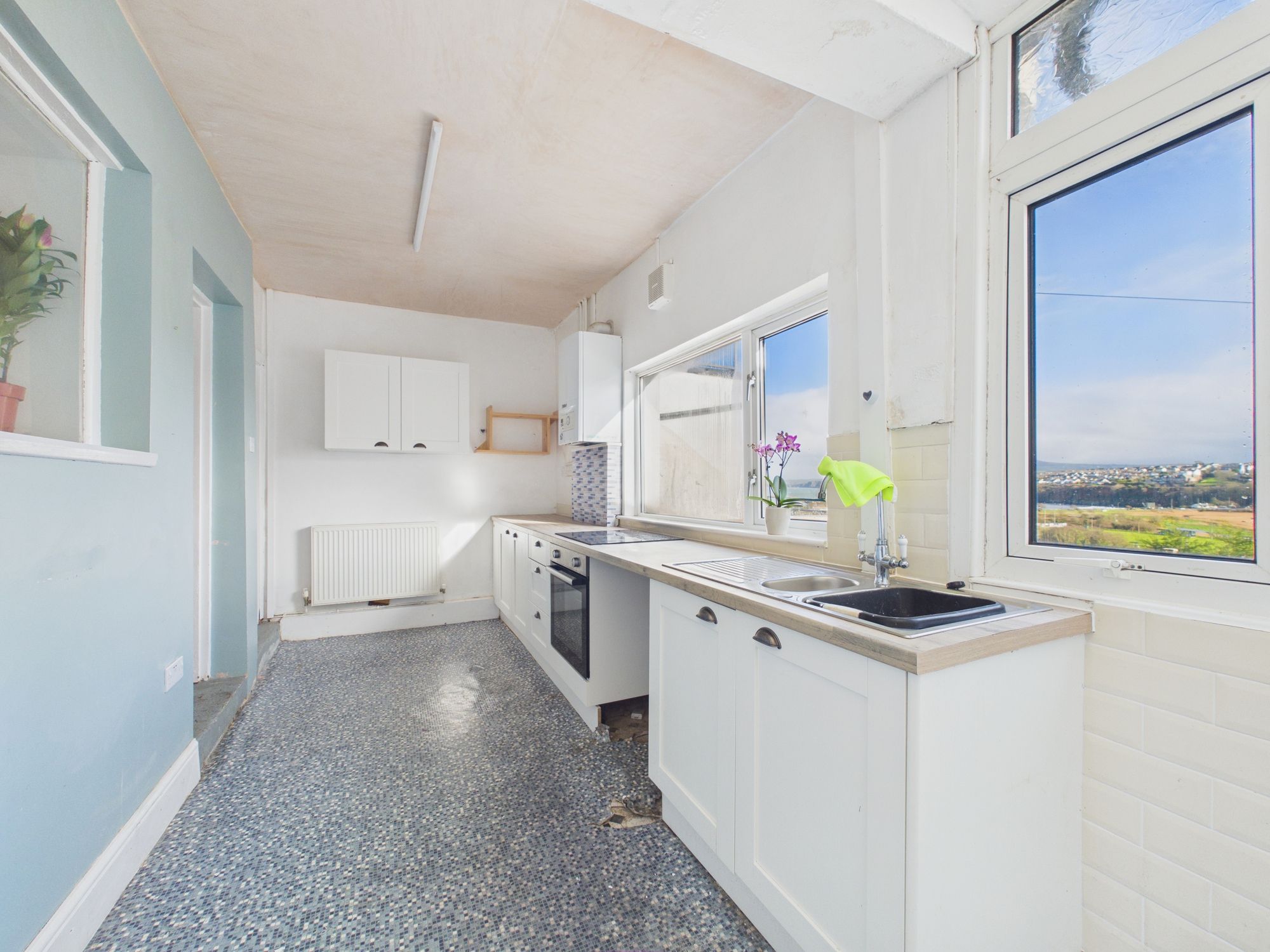The property is situated just a ten minute walk from the sea, making it perfect for those who appreciate the tranquillity and beauty of the coastline. Inside, the house is thoughtfully arranged to maximise space and comfort, with a welcoming entrance hall leading to a spacious living room and kitchen that benefits from captivating coastal views. The kitchen is well equipped with ample storage and workspace, making it ideal for both every-day family meals and entertaining guests.