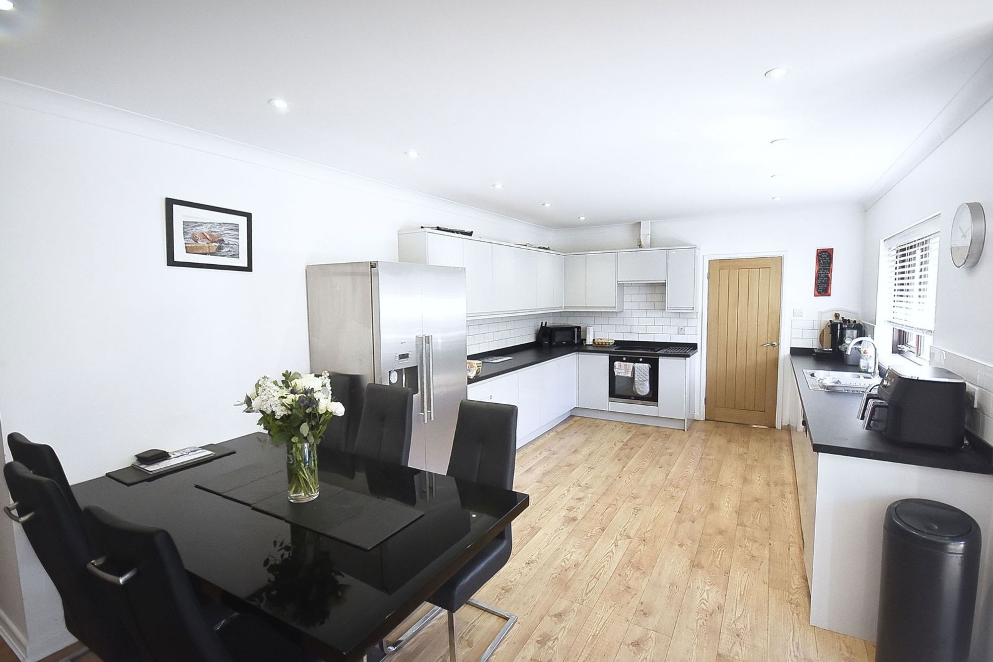 Enter through the timber glazed door. WIth laminate flooring and a range of matching wall and base units. Integral cooker, hob and dishwasher. Space for a large freestanding fridge/freezer. Intergral sink and drainer. Window to the rear. French doors to the rear garden. Ample space for family dining suite. Door to utility room.