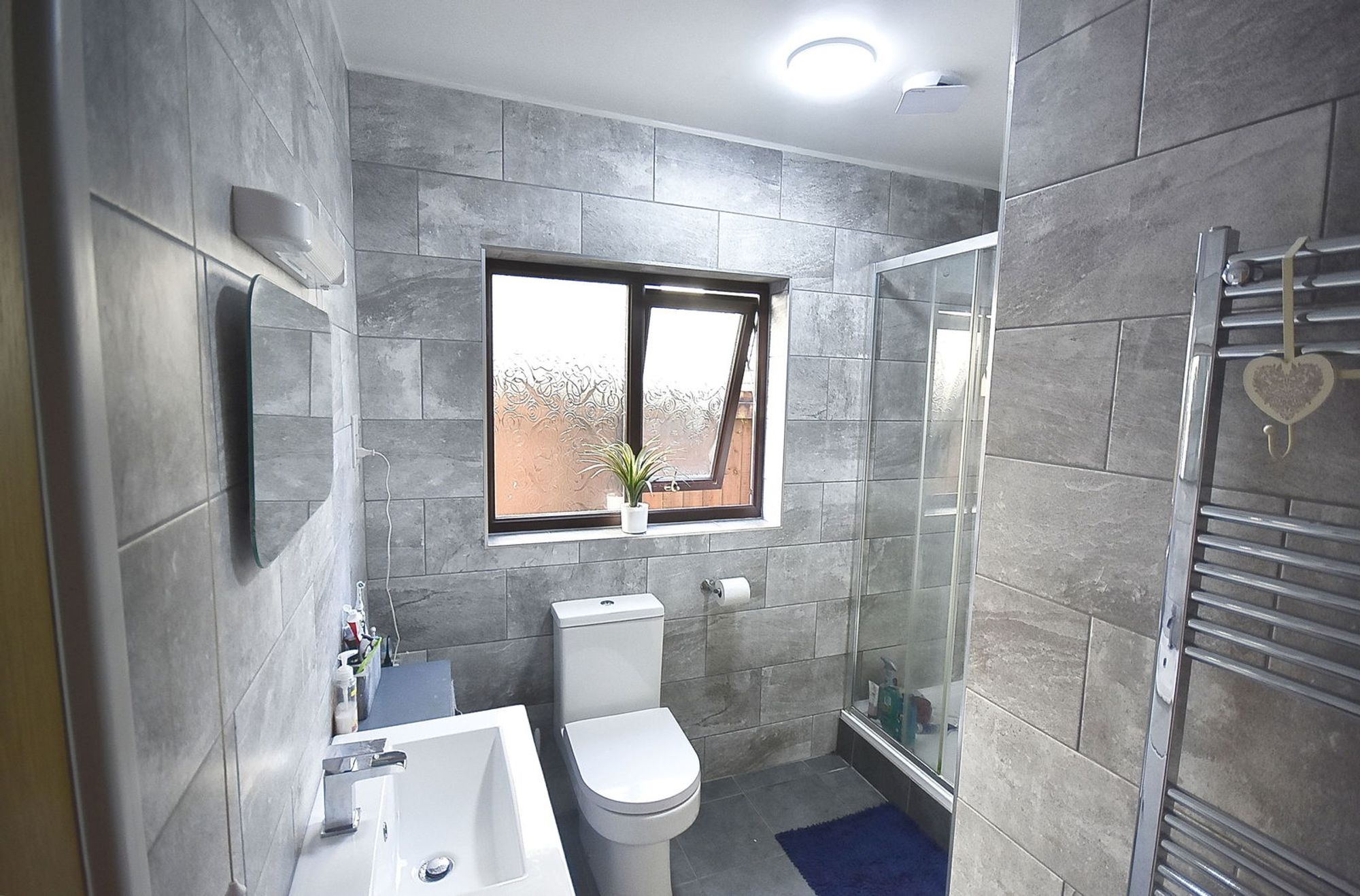 Large modern ensuite bathroom with WC, vanity unit wash hand basin. Fully glazed mains connected shower enclosure. Frosted window to the side. Fully tiled walls and tiled floor. Heated towel rail.