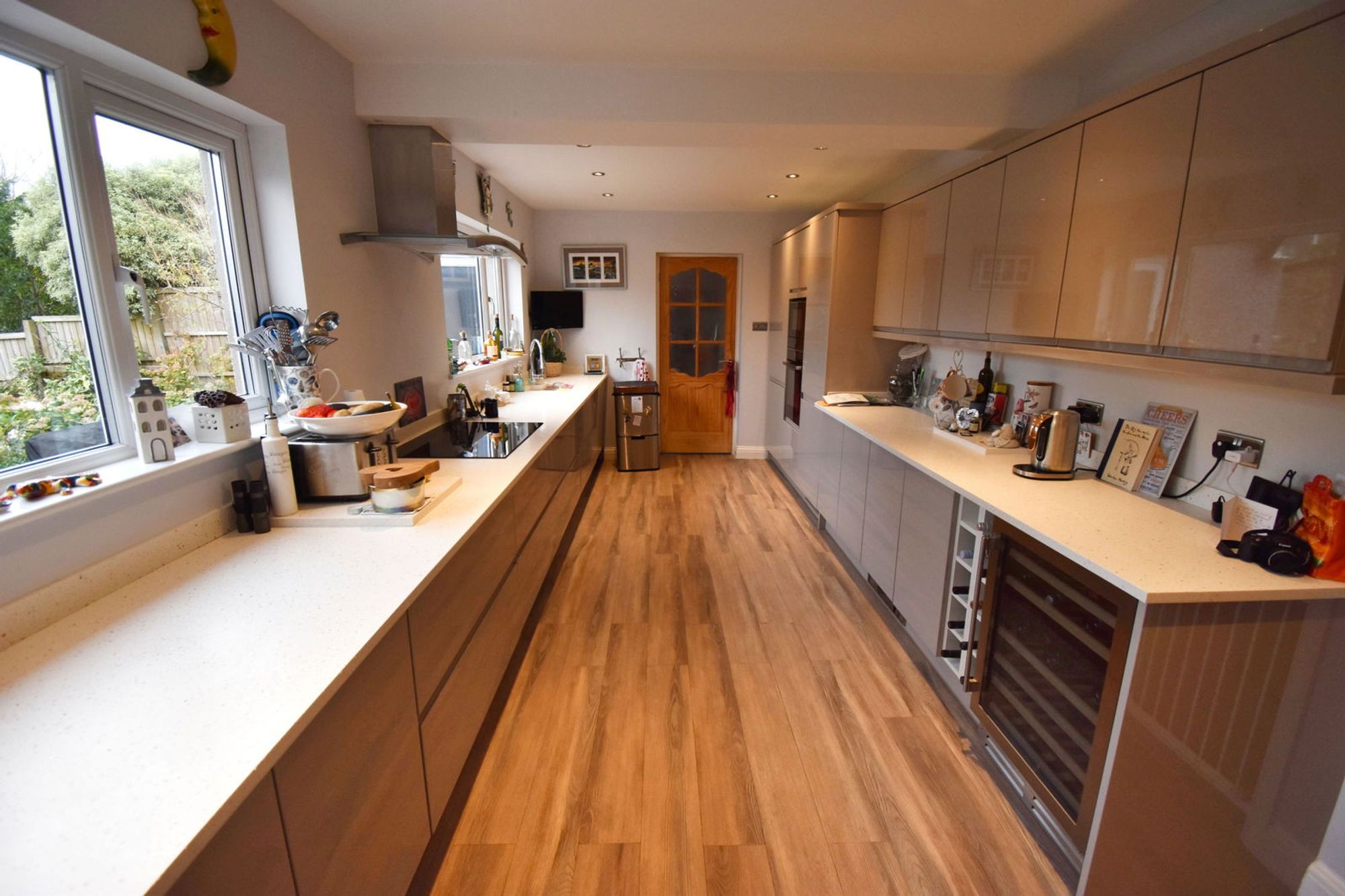 Two windows to rear enjoying beautiful views over the garden and the woodland beyond. Glazed doors to Dining Room and Lounge. Fitted with a range of contemporary wall and base units with matching quartz worktop. Quality integral appliances comprising larder fridge, dishwasher, Neff induction hob with extractor over, eye level Neff hide and slide double oven and microwave. Inset 1.5 ceramic sink with directional mixer tap over. Karndean flooring.