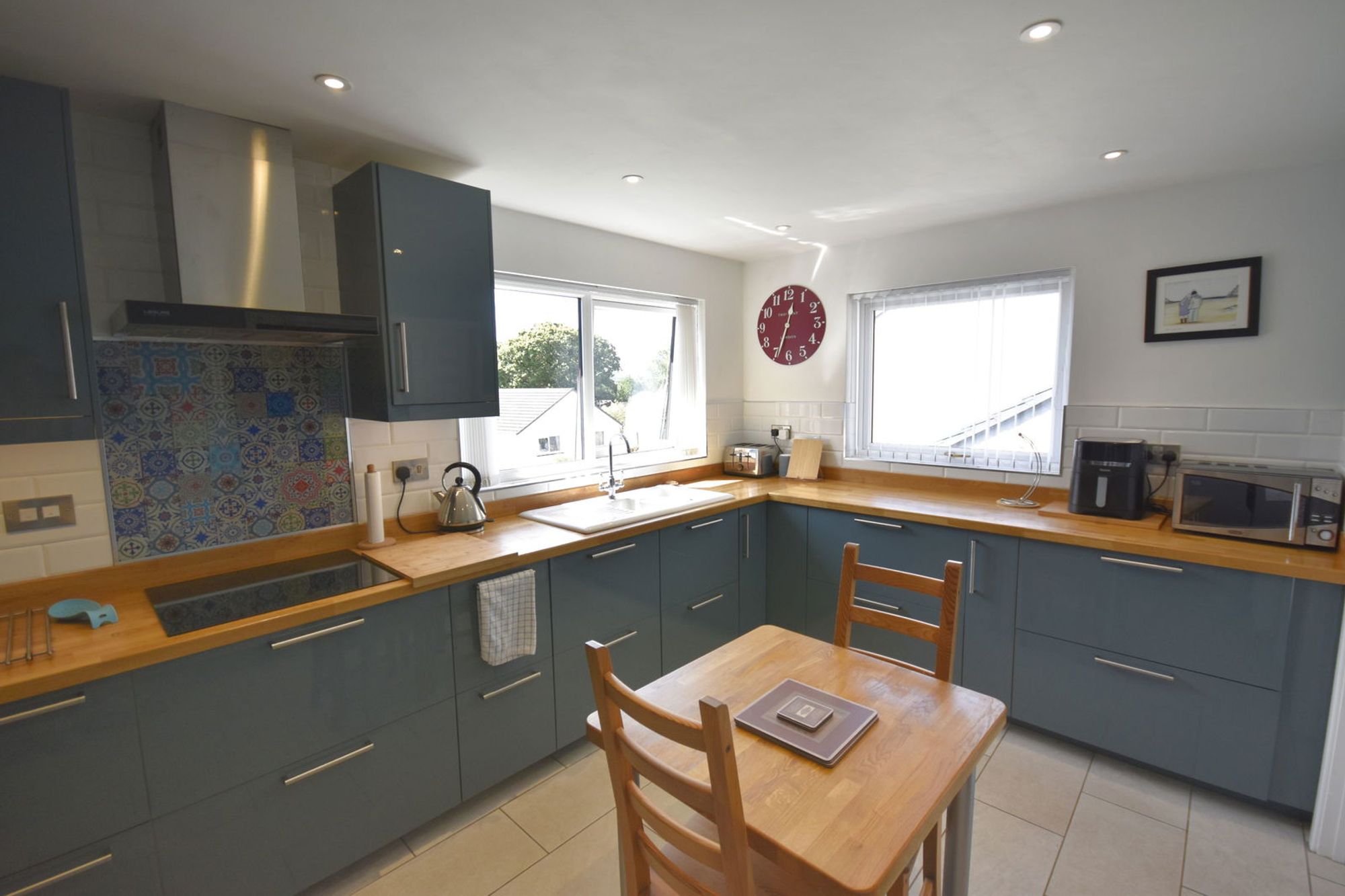 L-shaped kitchen/breakfast room with windows to the side and to the front. Fitted with a range of matching wall and base units, with an integrated dishwasher and double oven, and space and connection for a large fridge freezer. An induction hob with extractor over, and a white porcelain double sink and drainer with traditional style mixer tap over.