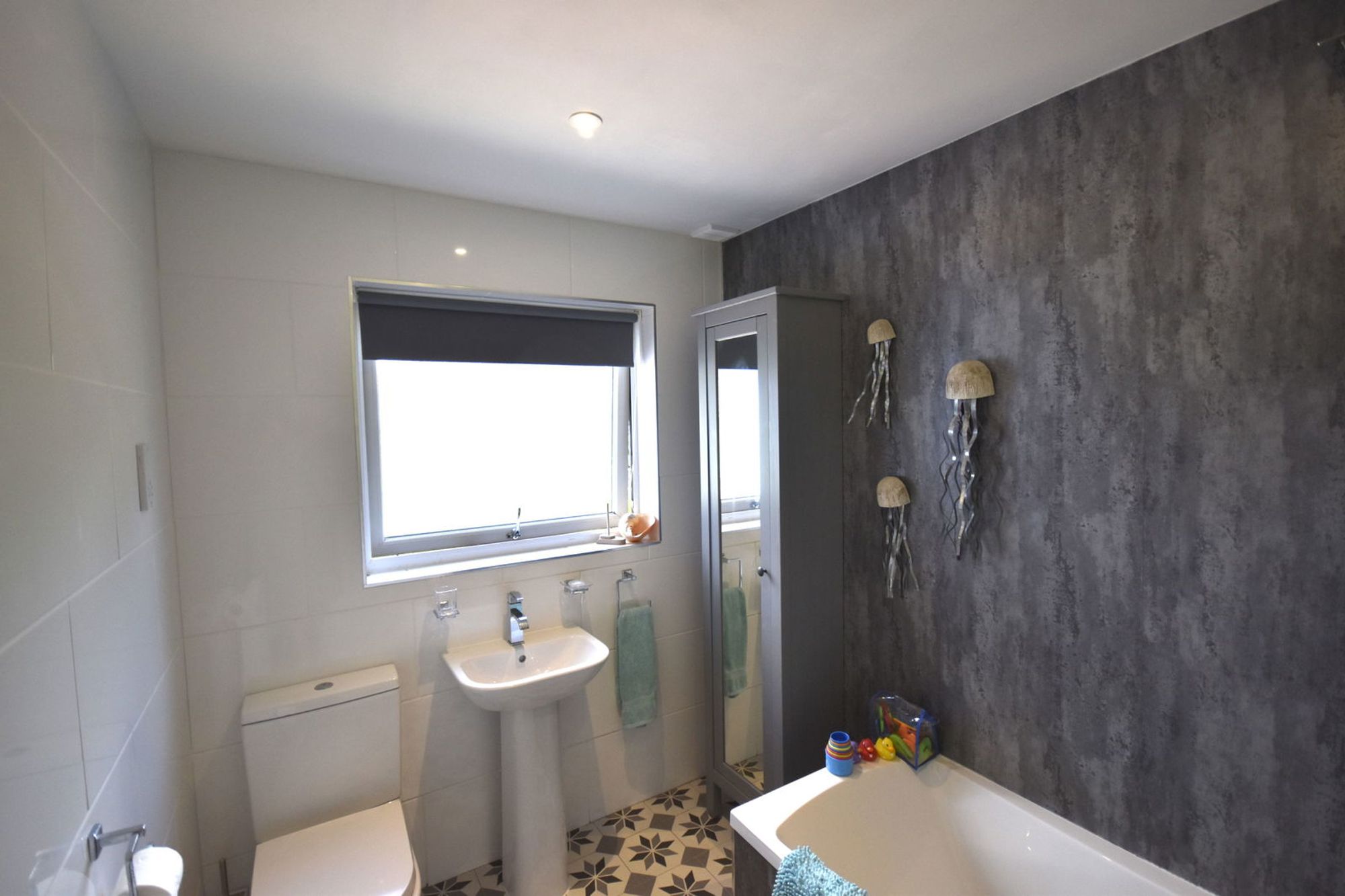 Solid wooden door to Family Bathroom. Frosted window to the rear. Matching WC and pedestal wash hand basin. Rectangular shaped bath with mixer shower over and concertina shower screen with water resistant panelling. Partly tiled walls and tiled floor.