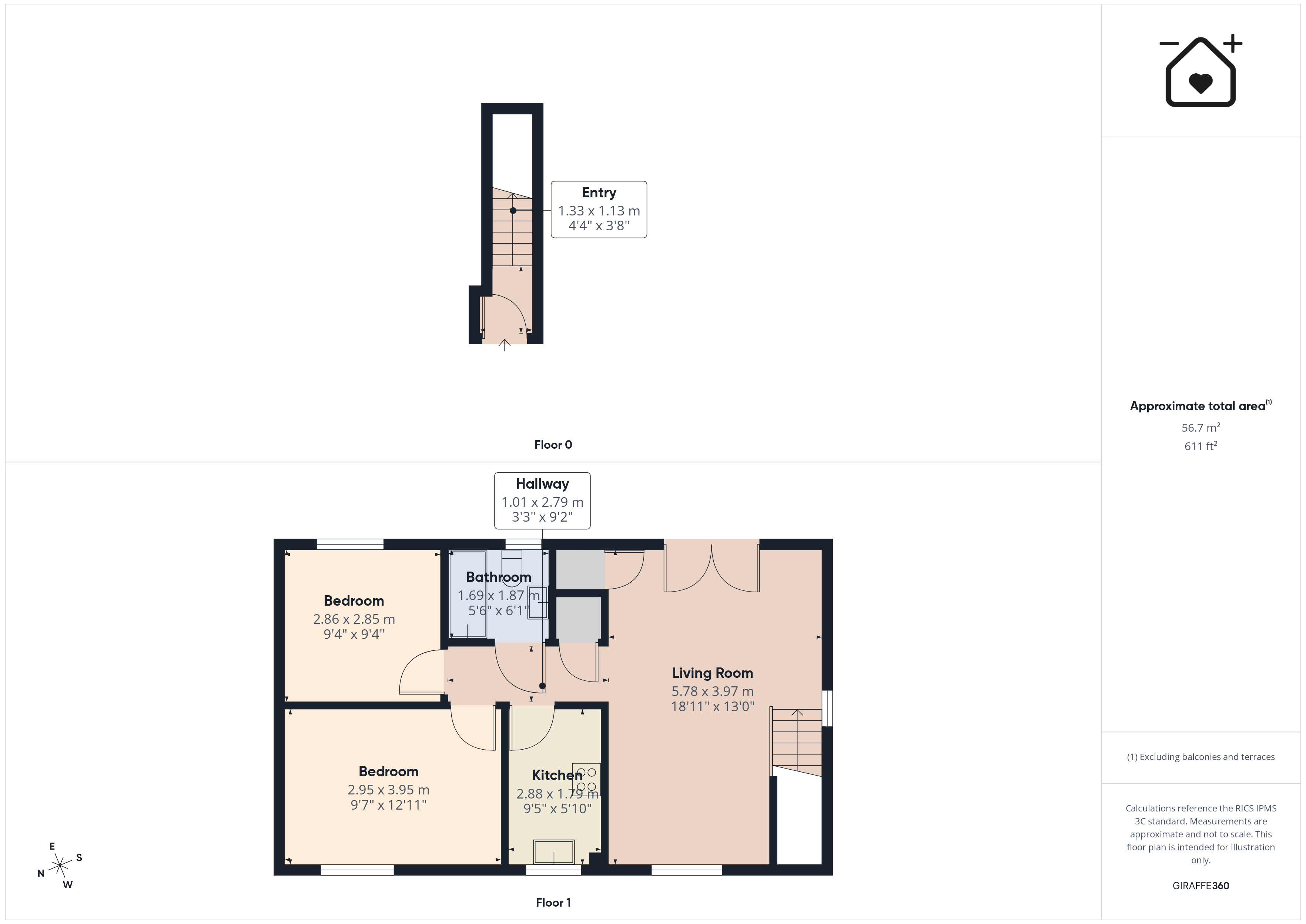 Entry/Stairway 4' 4" x 3' 8" (1.33m x 1.13m)