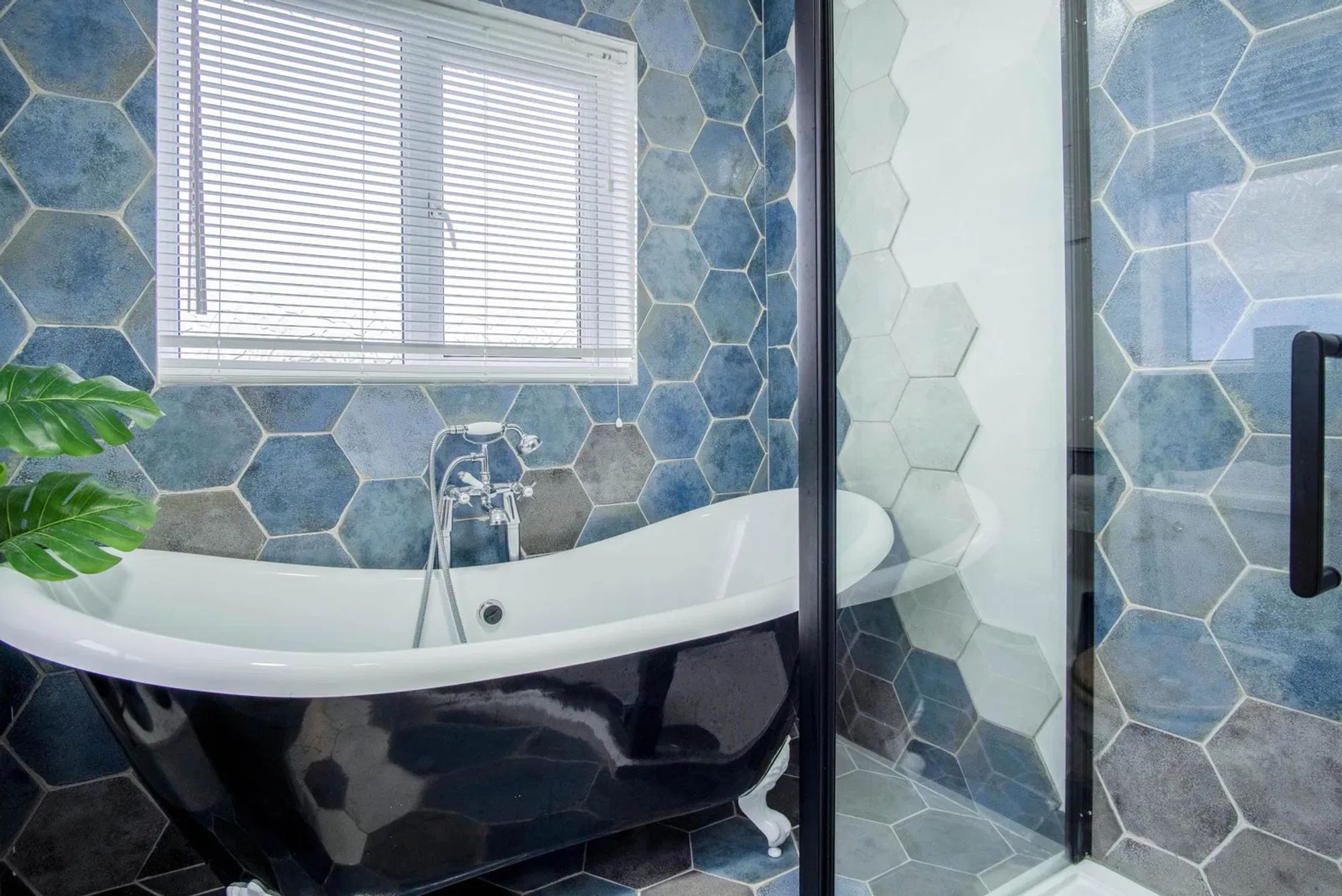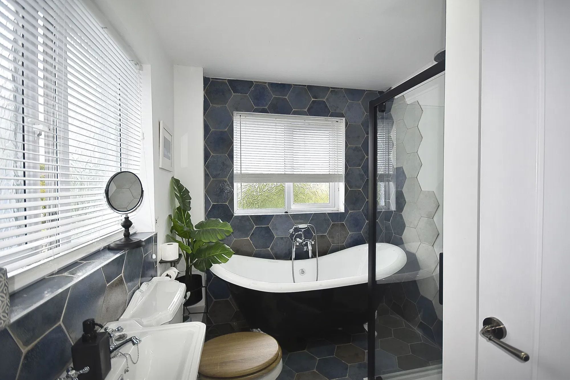 A beautifully designed family bathroom, refurbished only last year, with frosted windows to the side and to the rear. Featuring a freestanding roll top double ended bath, with a mixer shower over. A traditionally styled WC and wash hand basin. Mains connected shower enclosure with overhead waterfall and hand held shower. Partly tiled contemporary wave effect walls. Tiled floor. Heated towel rail.