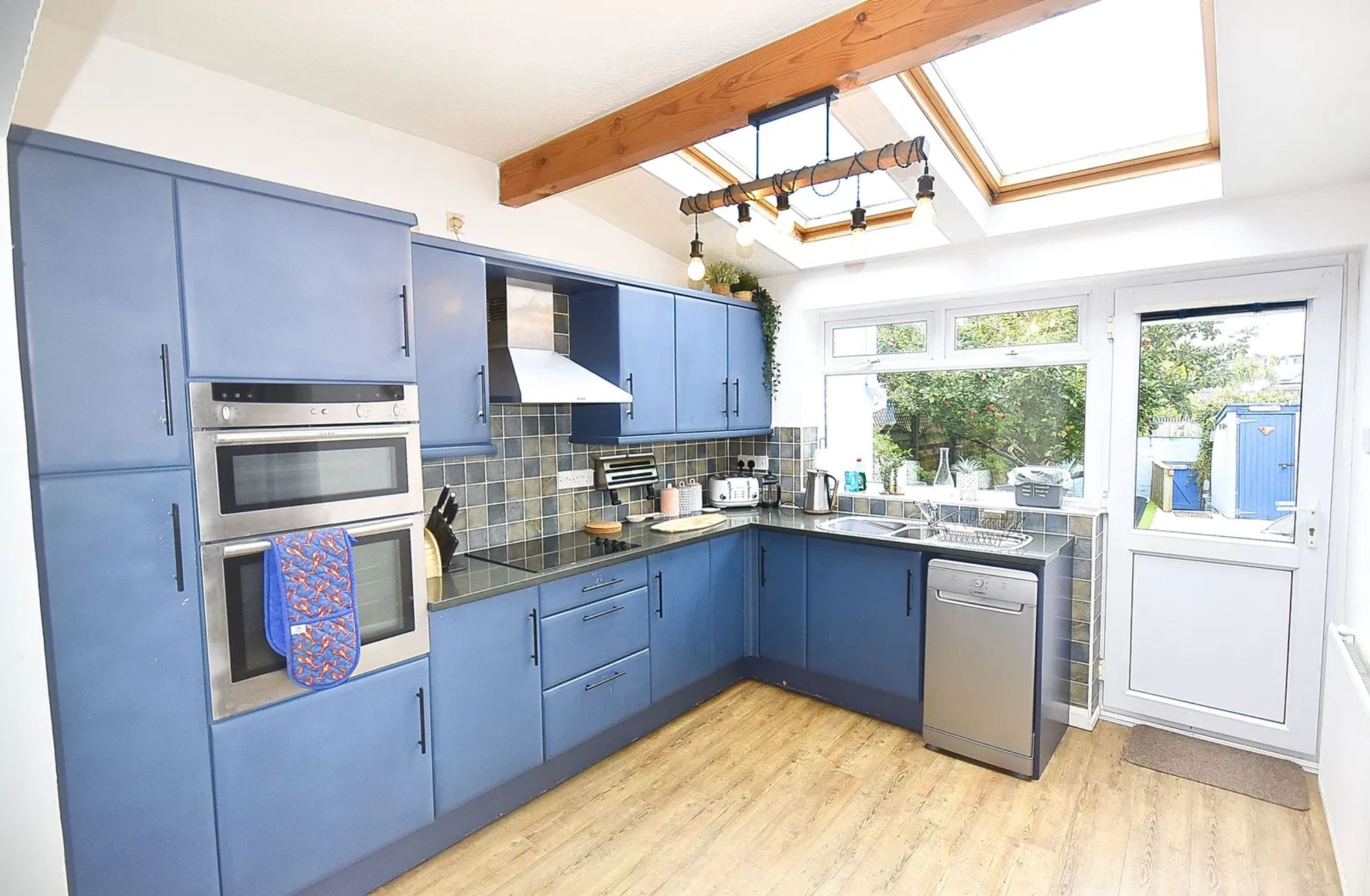 A modern and bright kitchen with a window to the rear, and a semi glazed uPVC door giving access to the rear garden. The kitchen also boasts a double velux in the roof allowing the natural light to flood in. Fitted with a range of matching wall and base units, integral eye-level double oven, integral induction hob with extractor over. Space and connection for a slimline dishwasher. Stainless Steel sink and drainer with mixer tap over. Partly tiled walls. Solid wood flooring. Features lovely exposed beams with a modern light fitting.