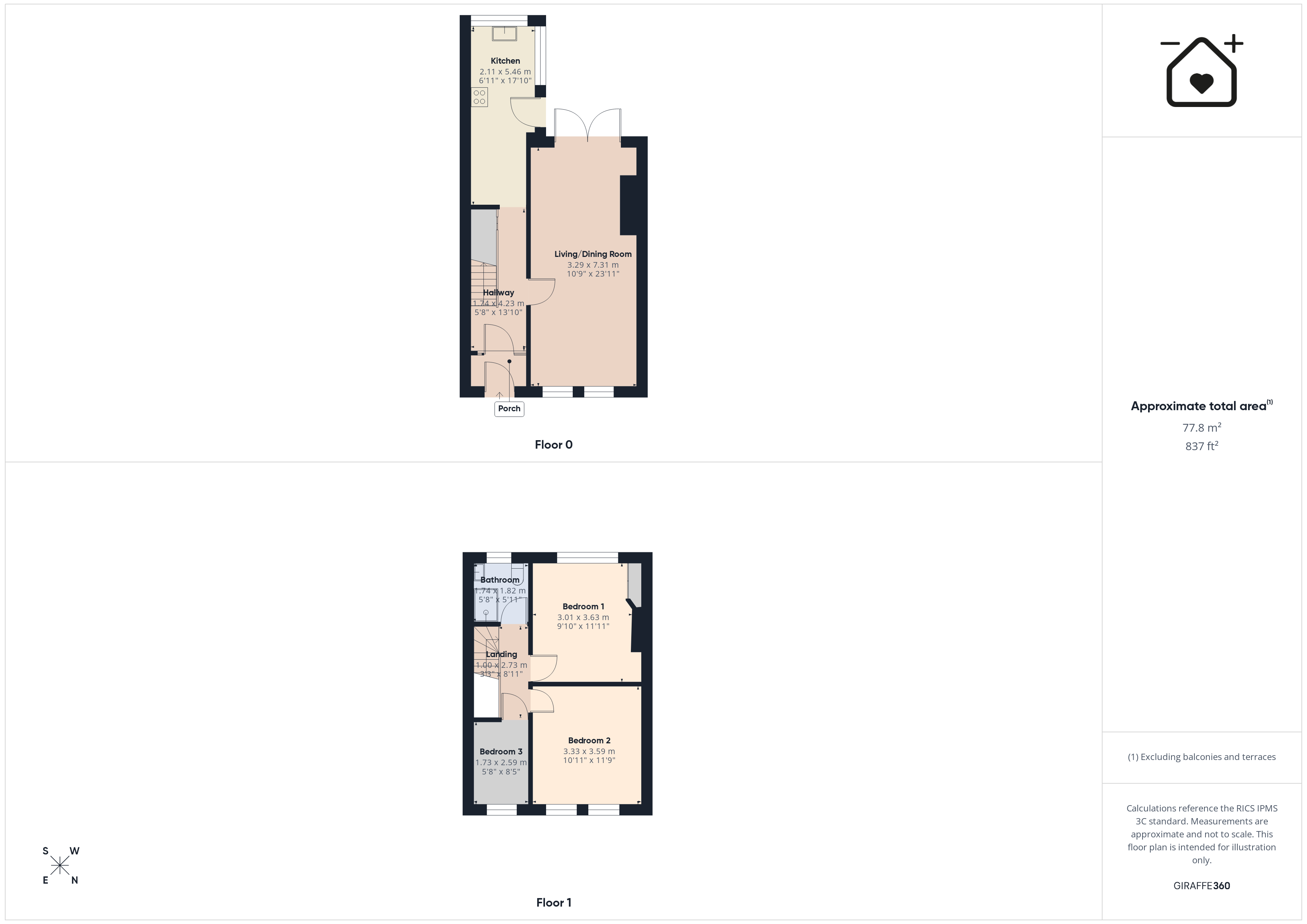 Landing 3' 3" x 8' 11" (1.00m x 2.73m)