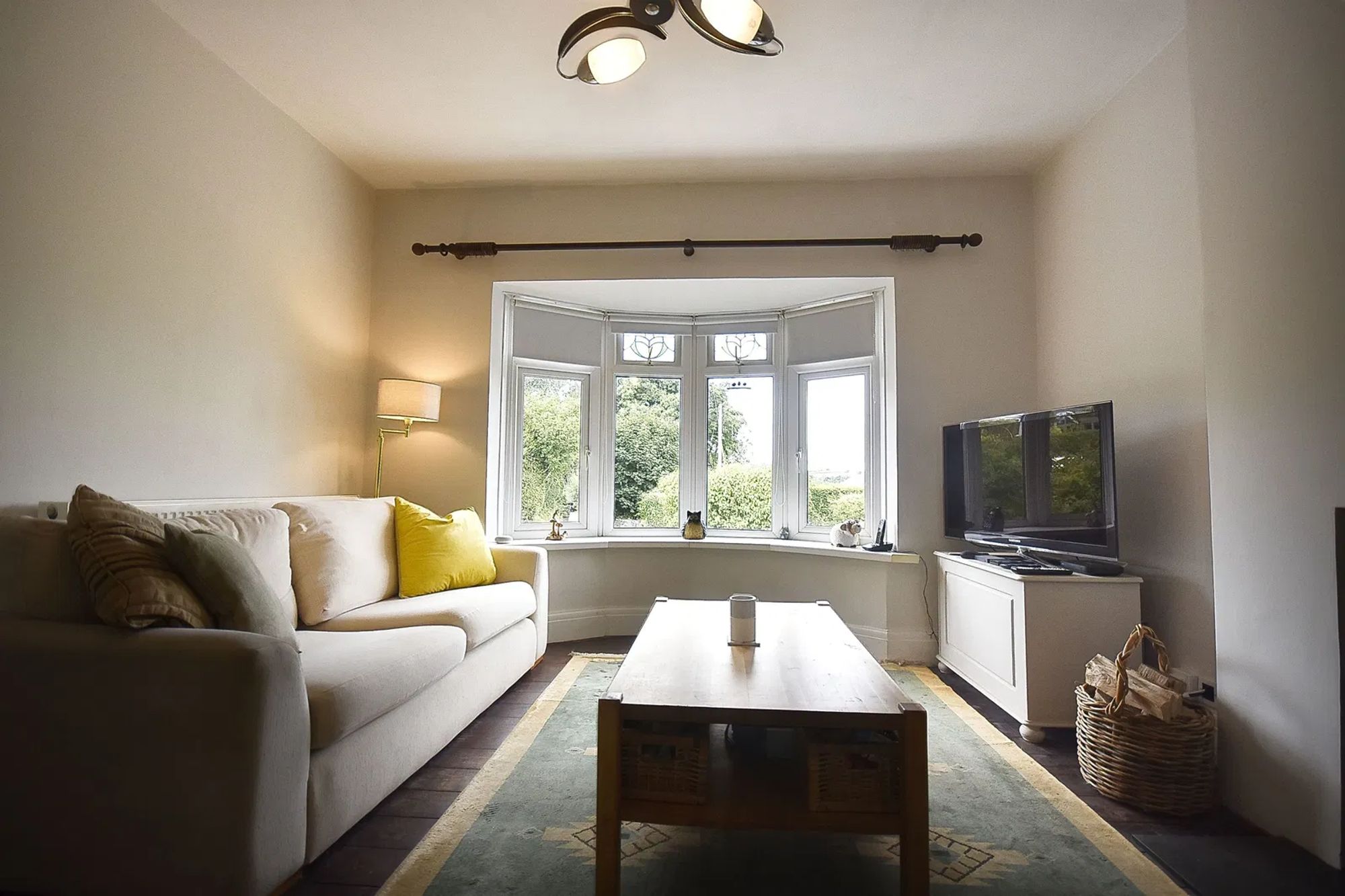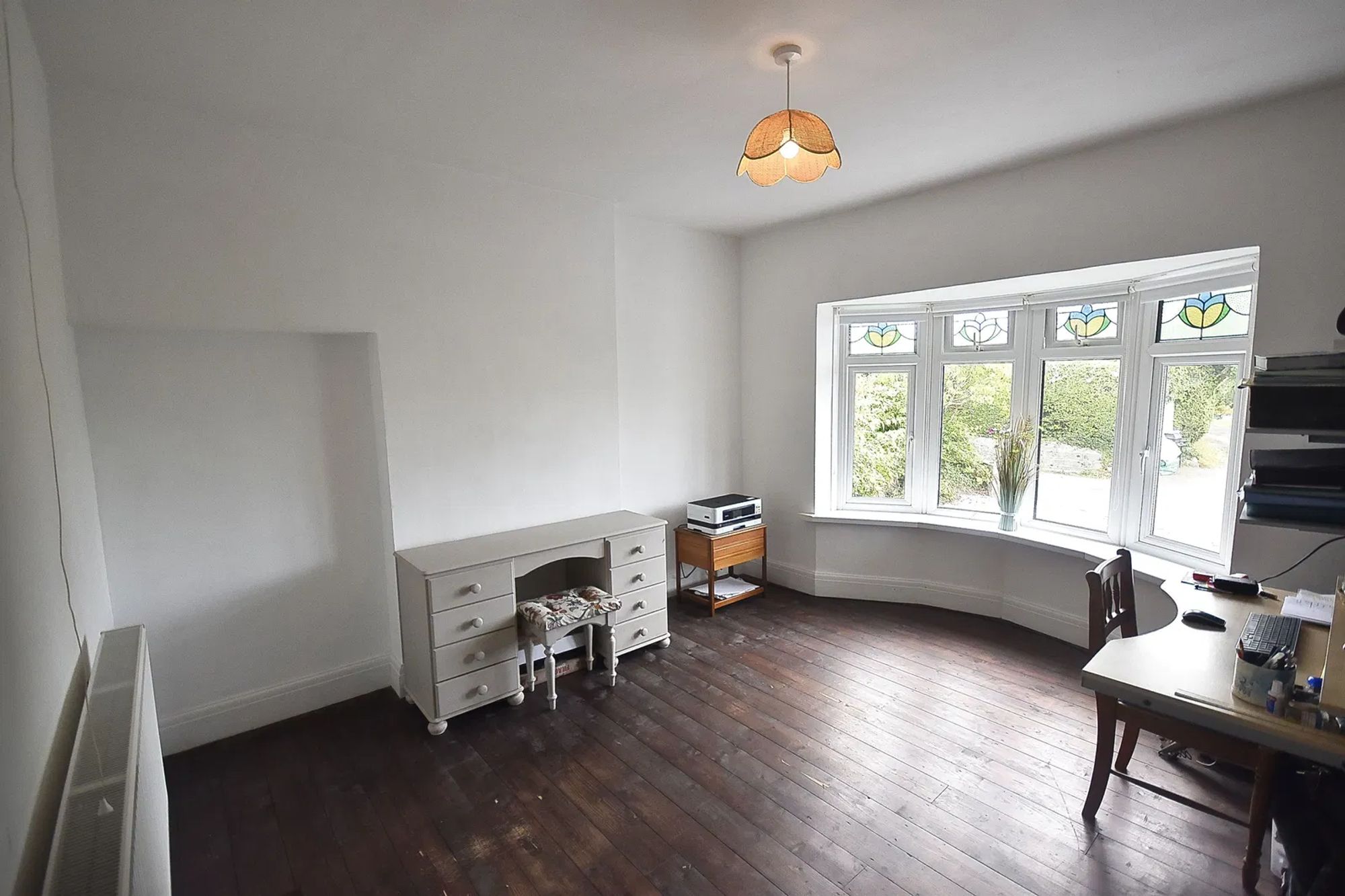 Double glazed bay window to front, overlooking driveway. Original hardwood suspended timber floor. Wood burning stove.