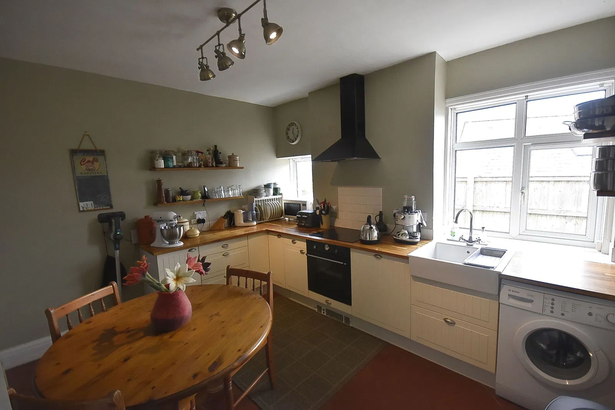 A large and tastefully decorated kitchen/diner with a range of matching wall and base units. Two original recessed windows to the side. Belfast sink. Integrated electric oven and hob with extractor over and dishwasher. Space and connection for washing machine. Built-in cupboard. Solid quarry tiled floor.