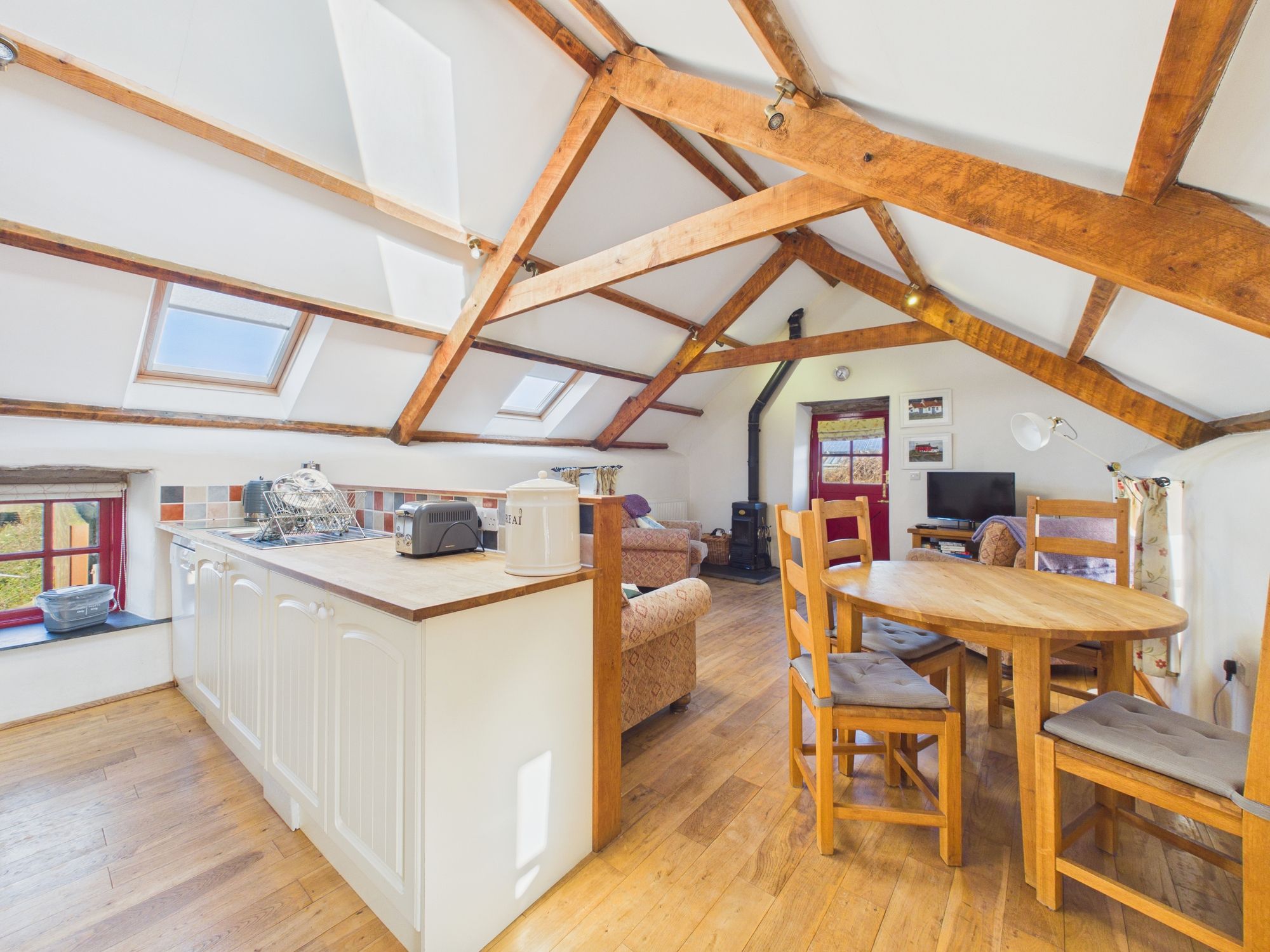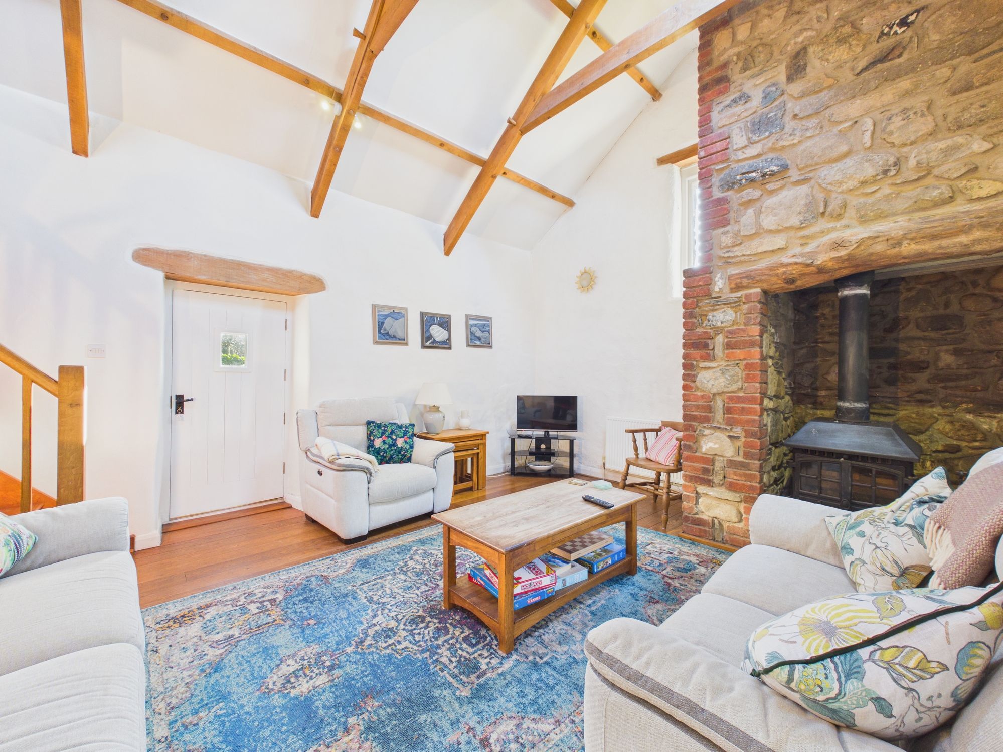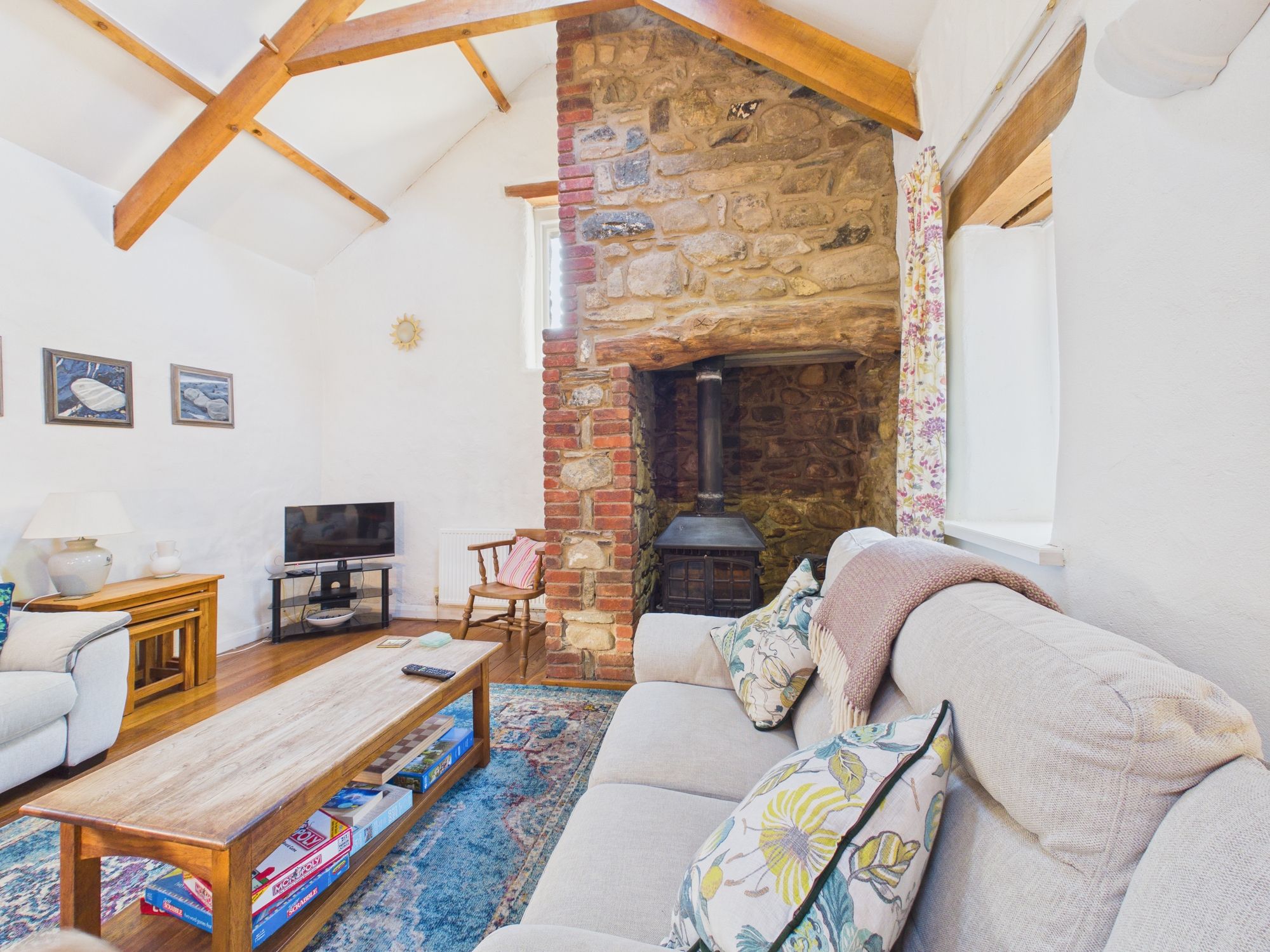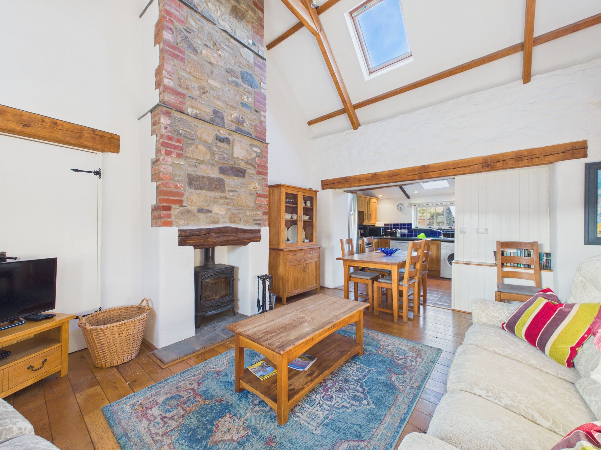 Ysgubor - The Barn, a beautiful cottage comprising kitchen opening to a wonderful lounge dining area with vaulted ceilings displaying the exposed beams and feature stove with floor to ceiling chimney, 2 bedrooms and a family bathroom.