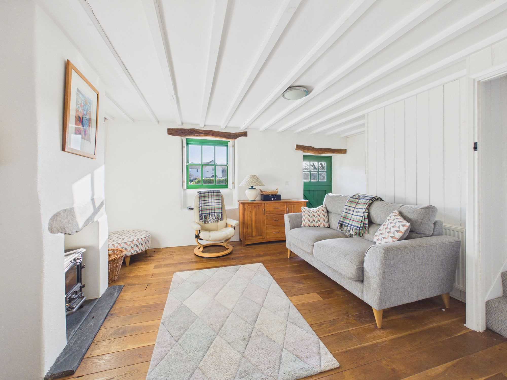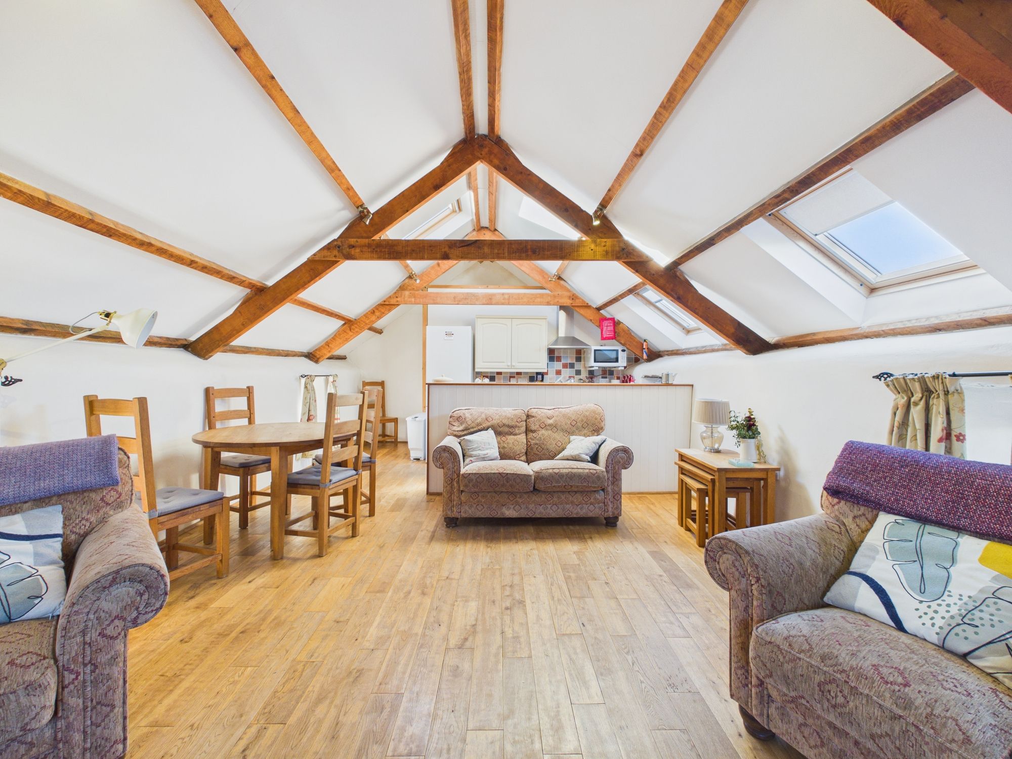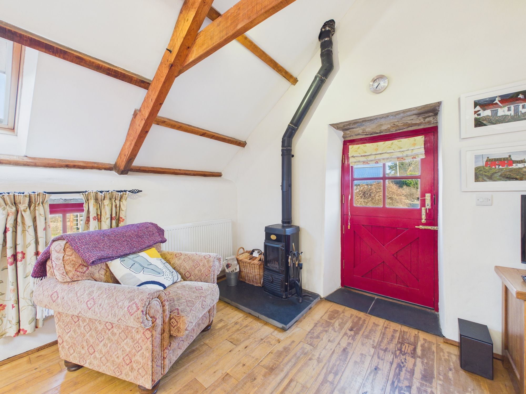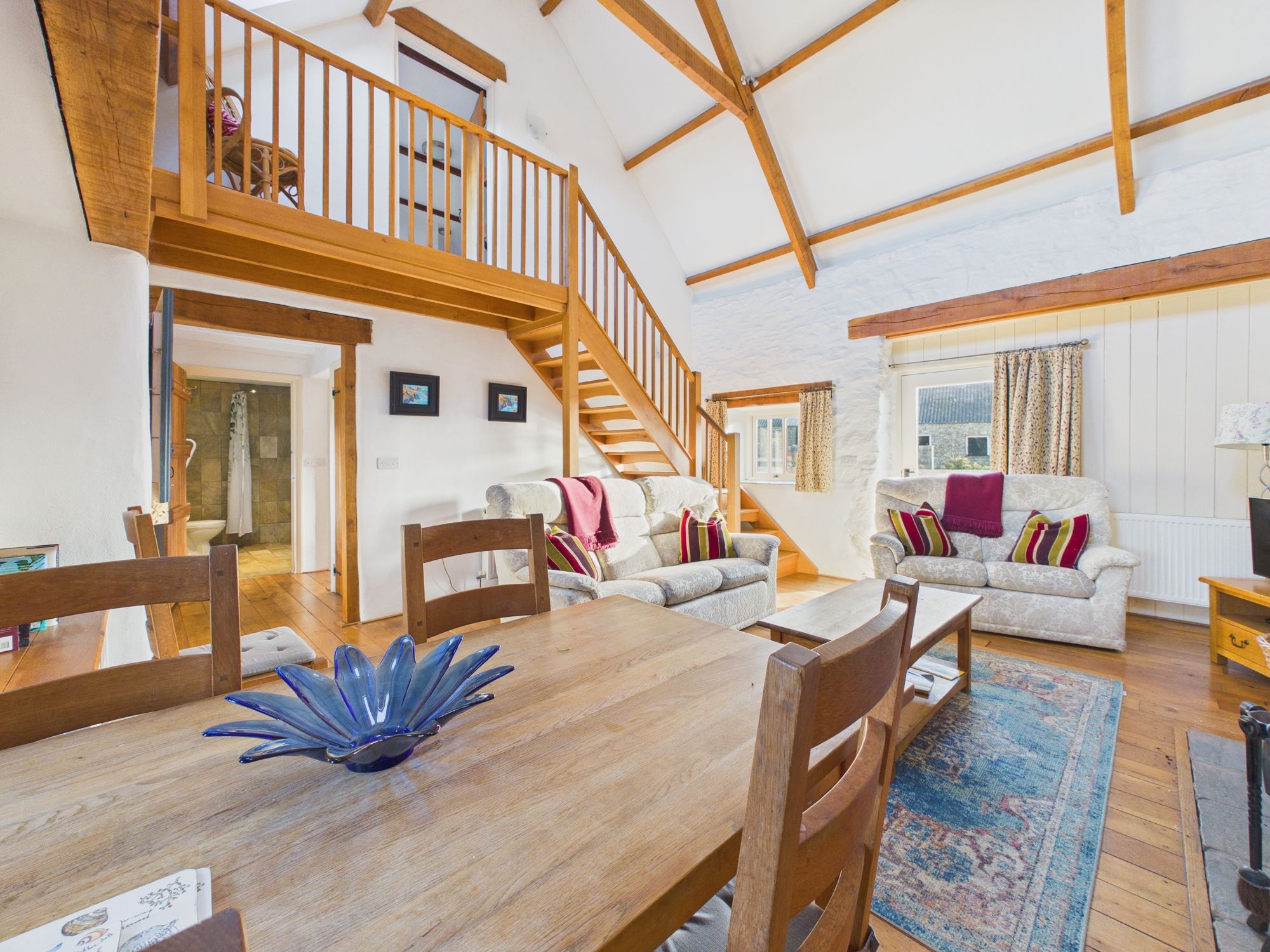 Ysgubor - The Barn, a beautiful cottage comprising kitchen opening to a wonderful lounge dining area with vaulted ceilings displaying the exposed beams and feature stove with floor to ceiling chimney, 2 bedrooms and a family bathroom.