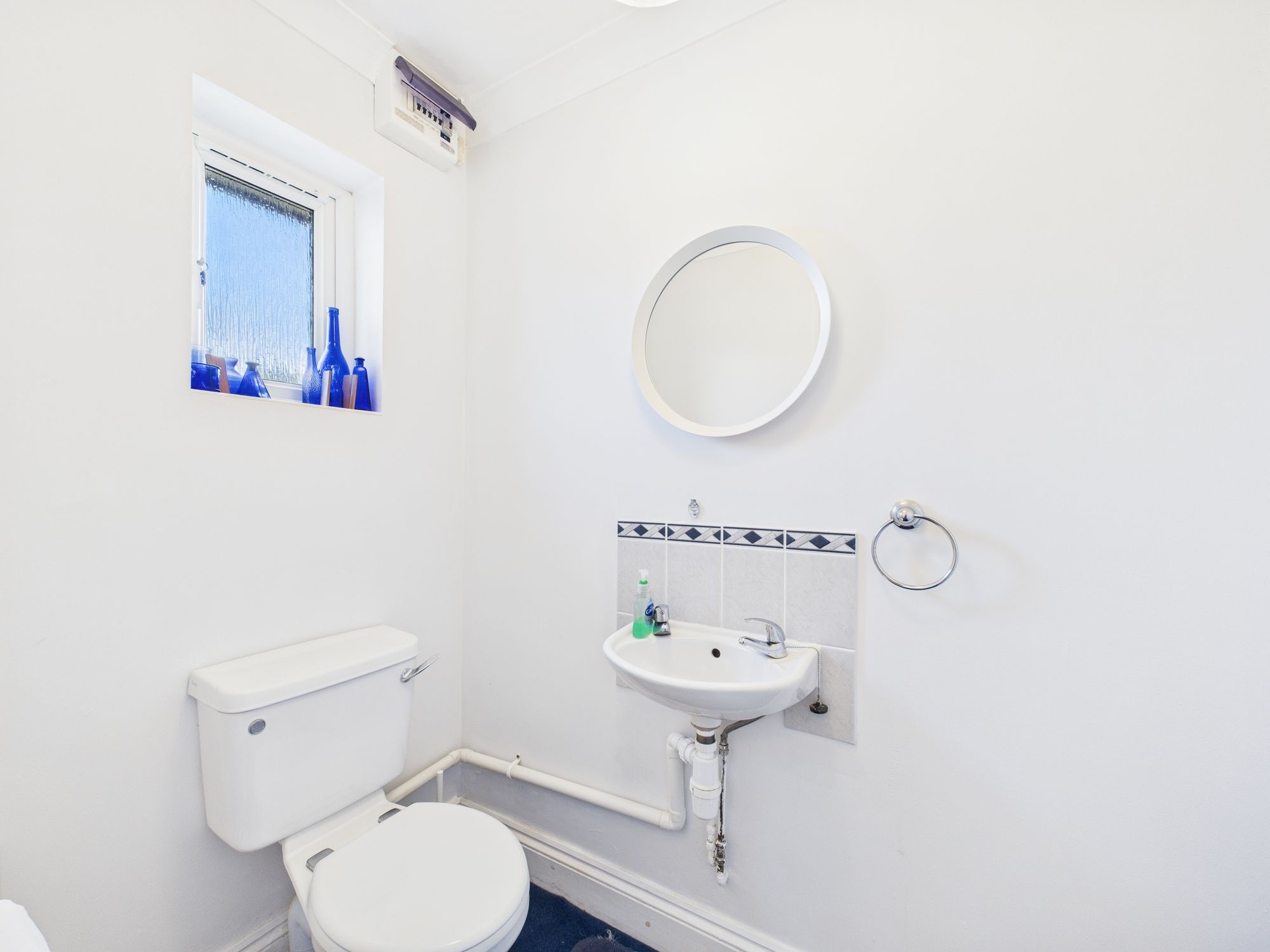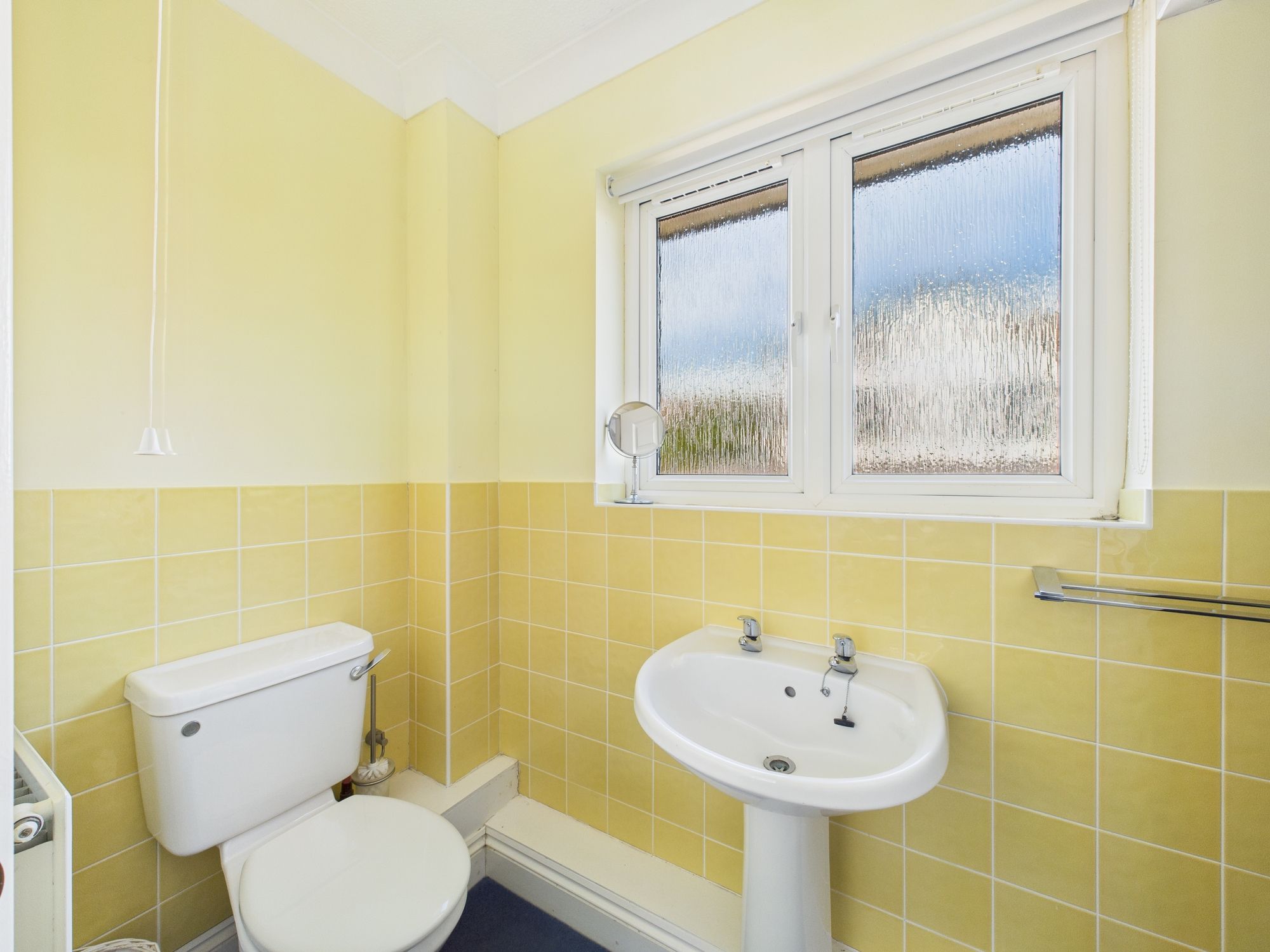 Frosted window to side. Fitted with matching suite comprising WC and wash hand basin in vanity. Part tiles walls.