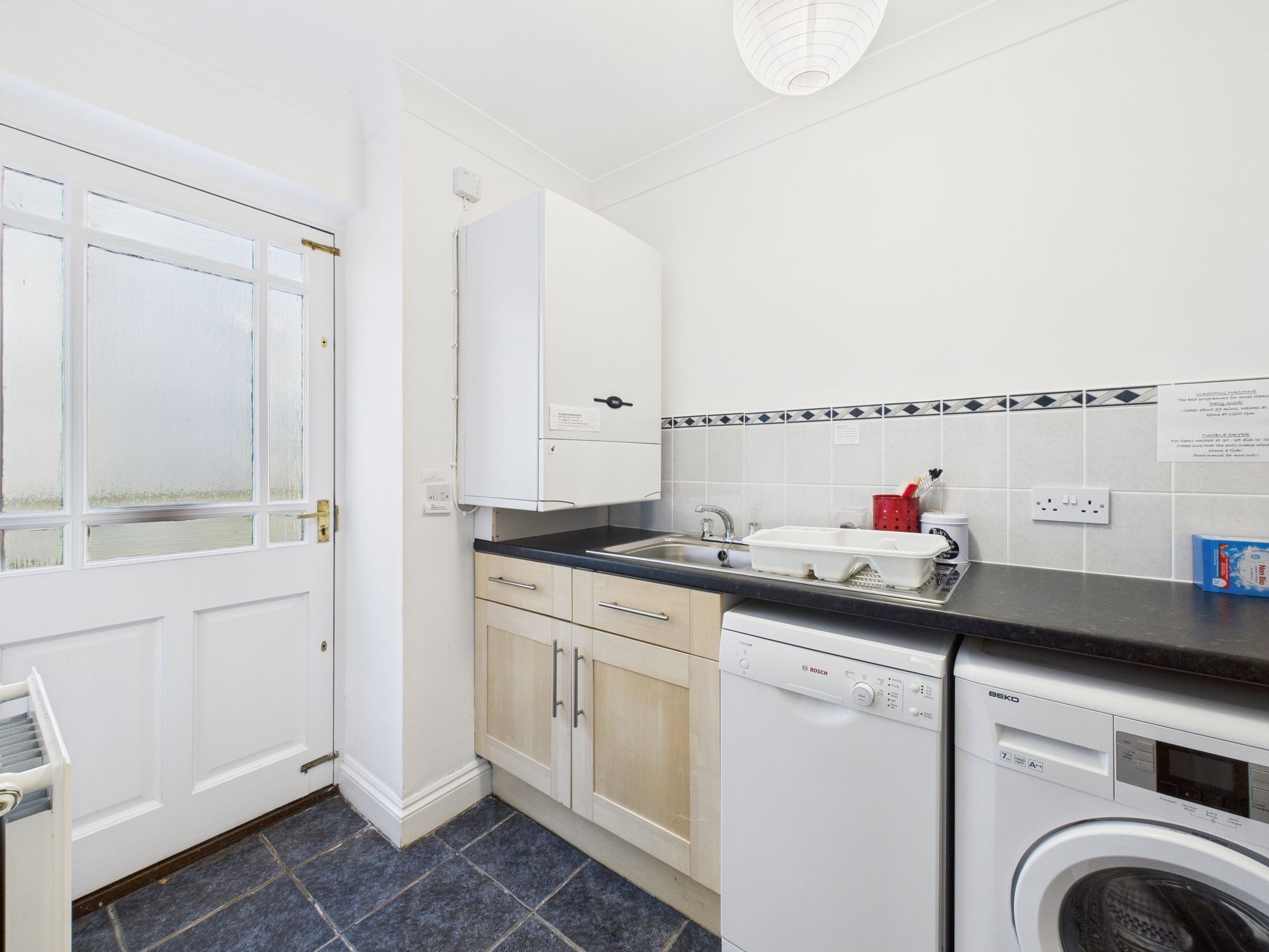 Fitted with a range of wall and base units with matching worktop. Inset stainless steel sink and drainer. Space and connection for washing machine, tumble dryer and dishwasher. Wall mounted large baxi max flow gas combi boiler. Glazed uPVC door to the side. Part tiled walls. Tiled flooring.