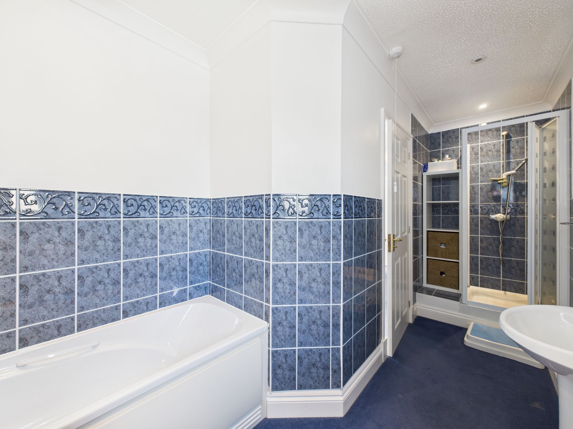 Frosted window to side. Fitted with matching modern suite comprising bath with mixer tap, WC, wash hand basin, and mains shower in separate glazed enclosure. Part tiled walls.
