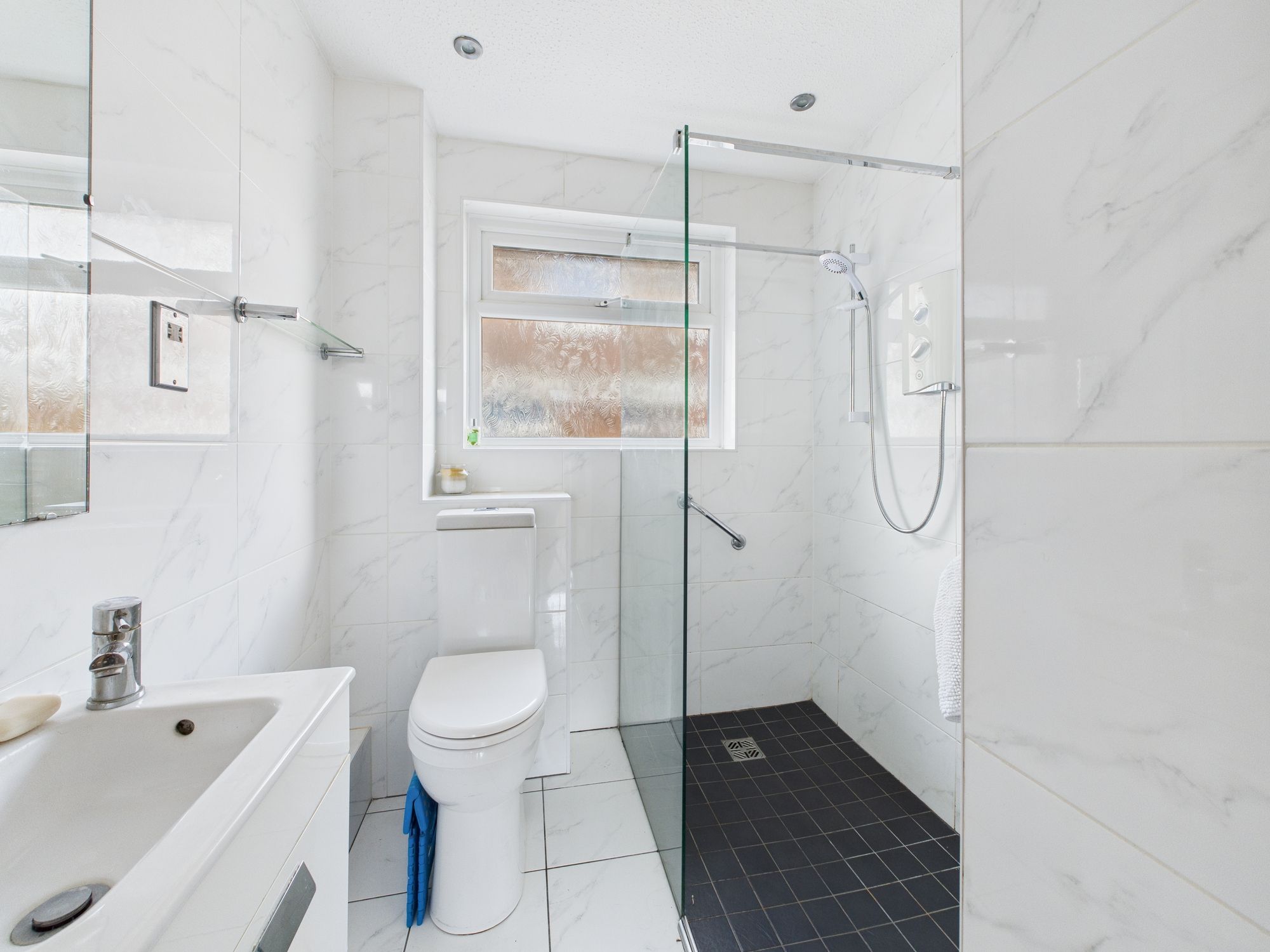 Shower behind cupboard doors, Sink with vanity