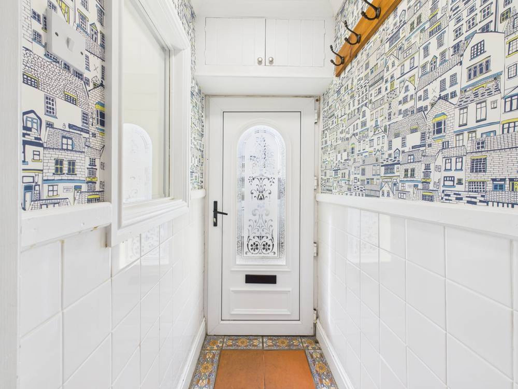 Enter via frosted pane uPVC door. Tiled floor and part tiled walls. Glass panelled door to lounge. Internal window to side to lounge.