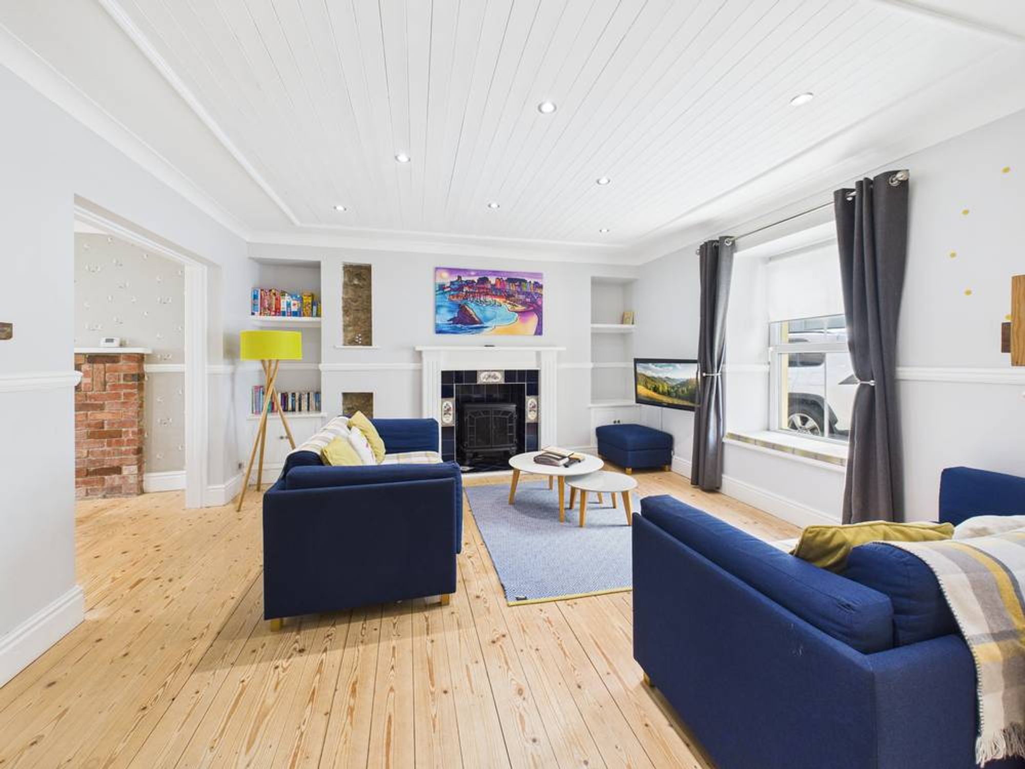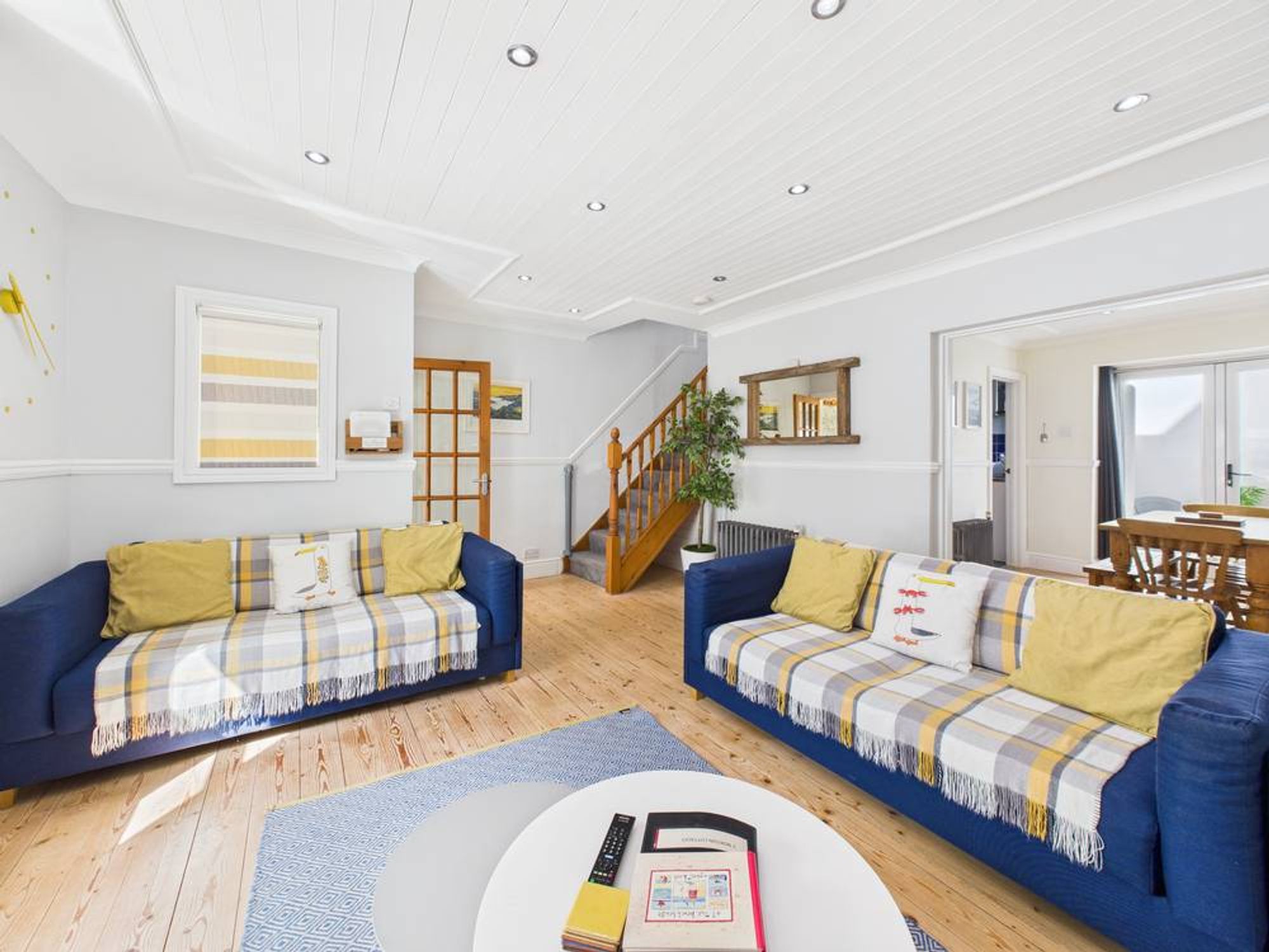 Window to front. Tiled fireplace with electric log burner type fire. Stripped and stained timber floorboards. Inset lighting. Stairs to First Floor. Opening to Dining Room.