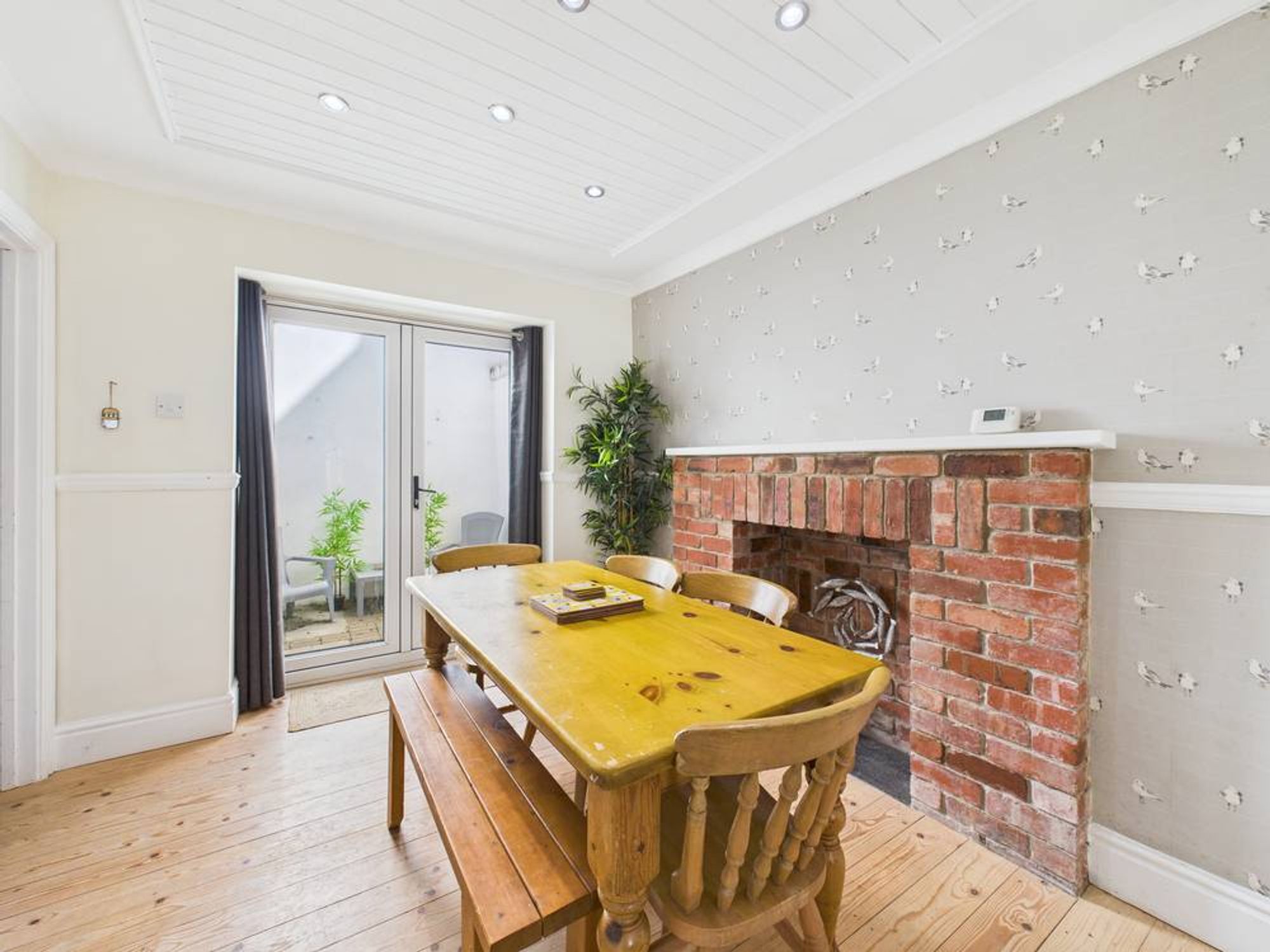 Feature brick fireplace with slate hearth. Door to built-in closet. French doors to rear giving access to Courtyard. Door to Kitchen. Inset lighting. Ample space for family sized dining suite. Stripped and stained timber floorboards.