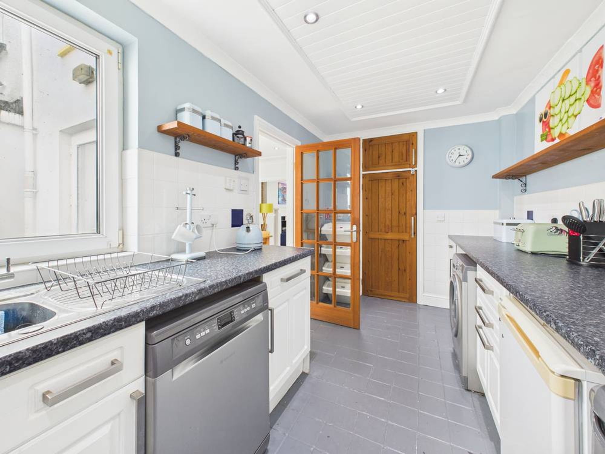 Window to side. Fitted with a range of wall and base units with matching worktop. Inset 1.5 bowl stainless steel sink with drainer. Built-in electric oven and grill and 4 ring gas hob with extractor over. Space and connection for dishwasher, fridge and freezer. Tiled floor and part tiled walls. Door to large walk-in pantry. Inset lighting.