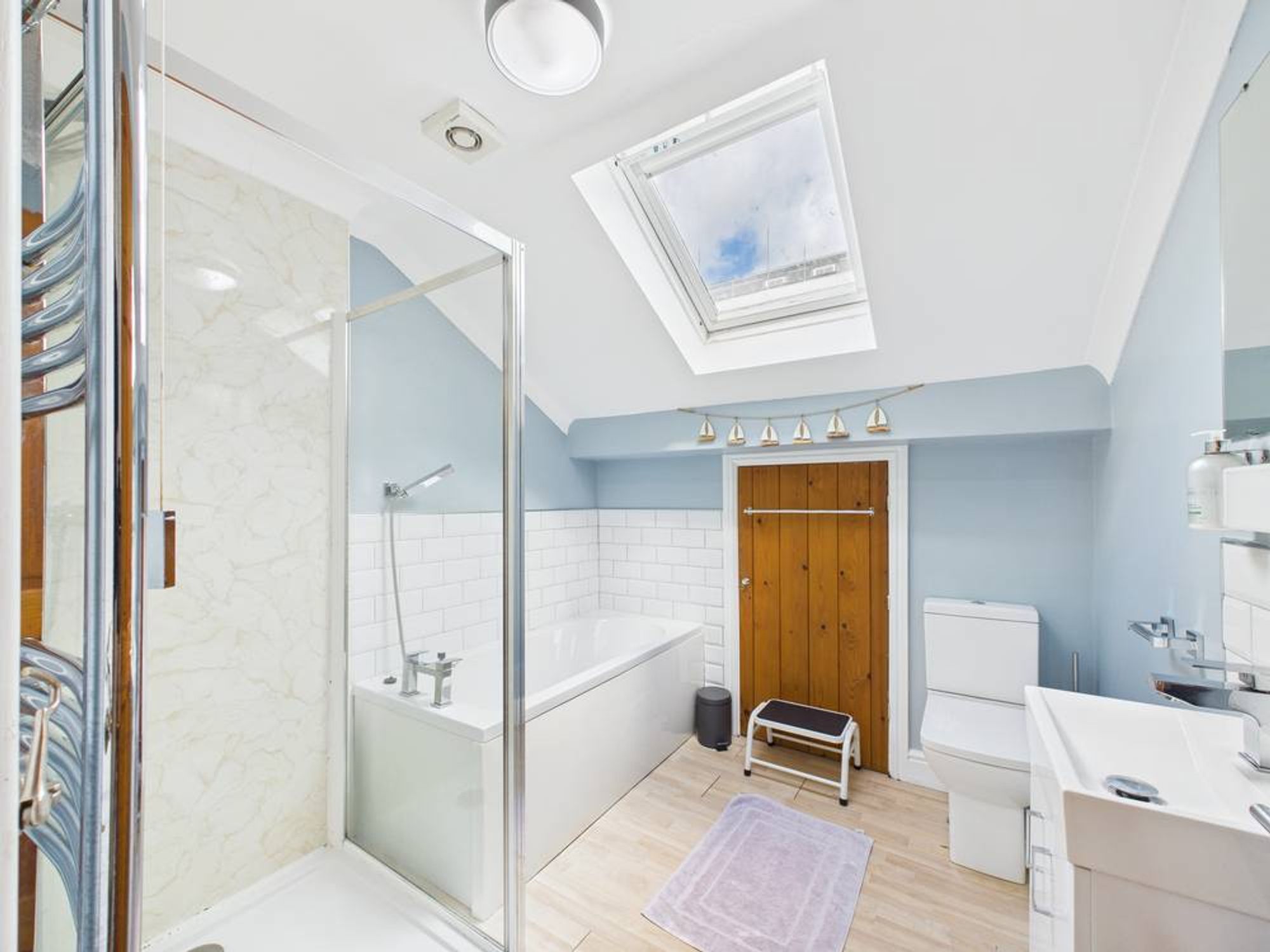 Fitted with WC, wash hand basin in vanity unit, bath with mixer tap and shower attachment, and mains shower in separate enclosure. Chrome towel rail. Laminate flooring. Velux window to rear. Door to cupboard in the eaves space housing newly installed wall mounted GloWorm gas combi boiler.