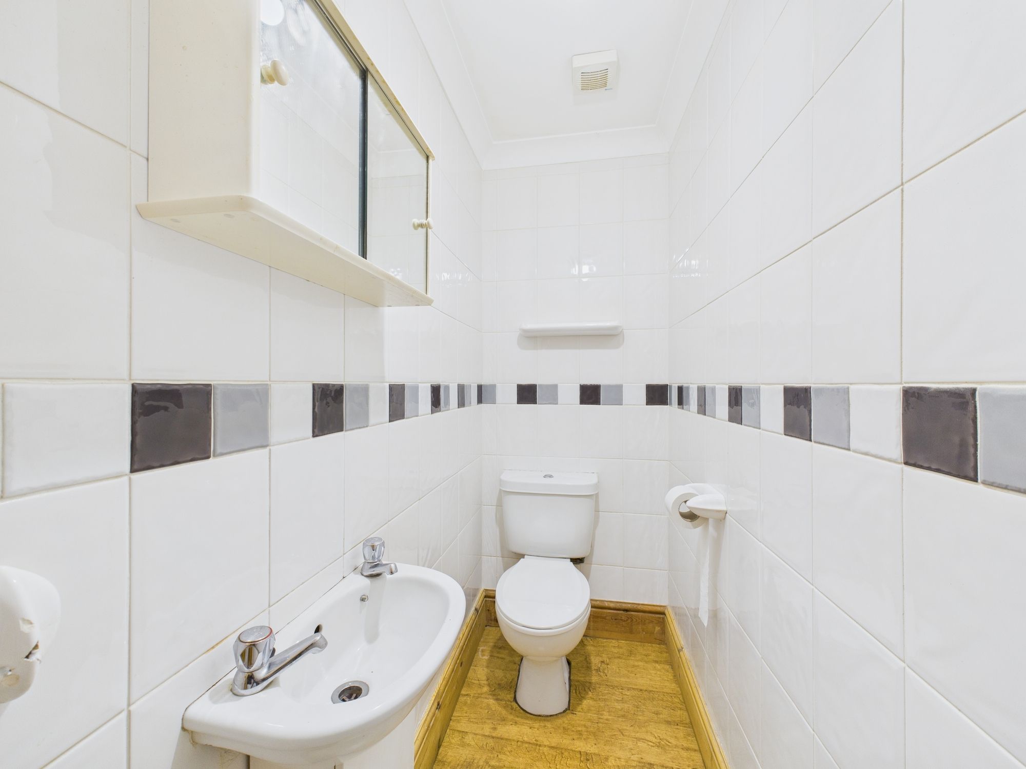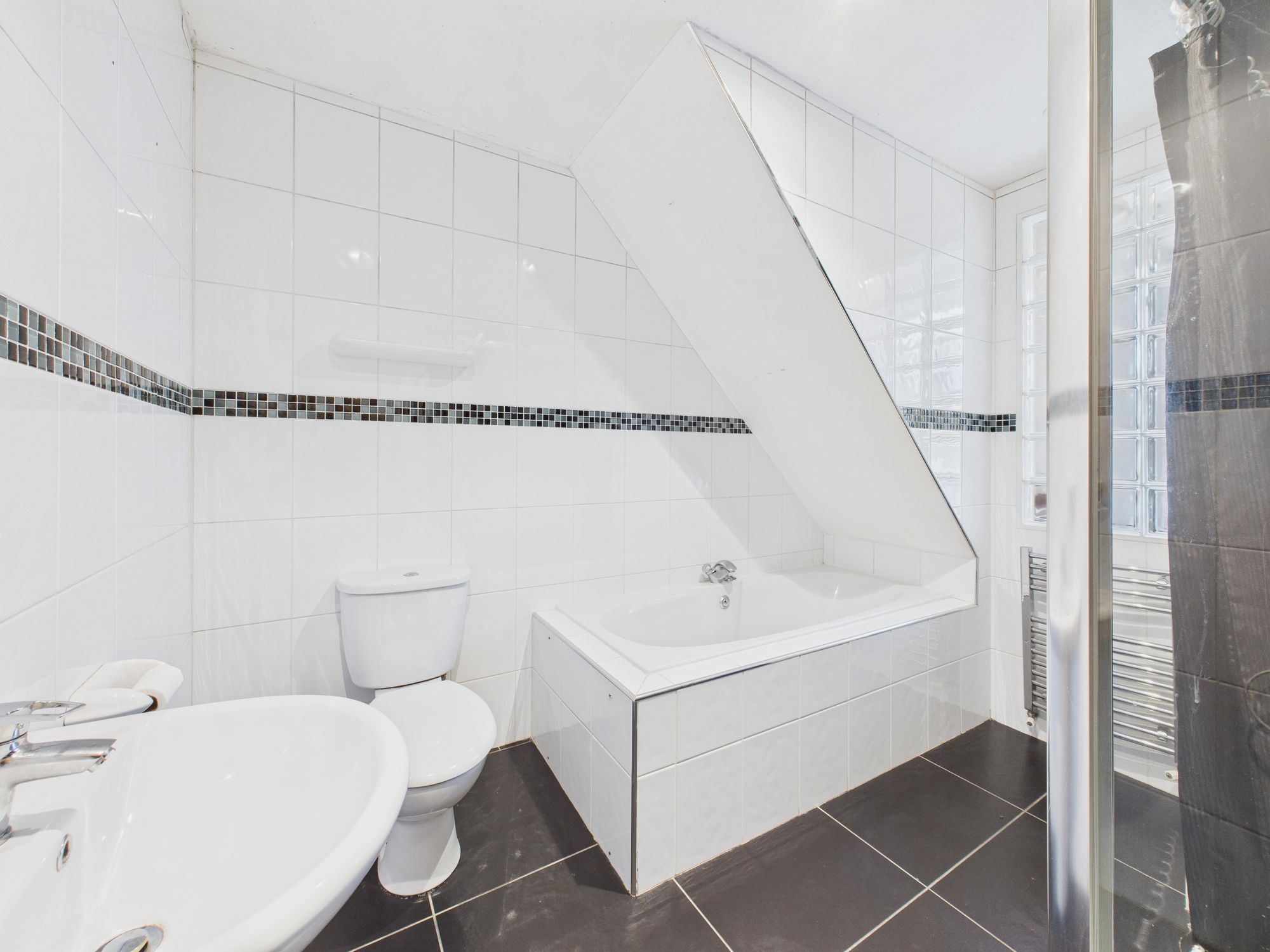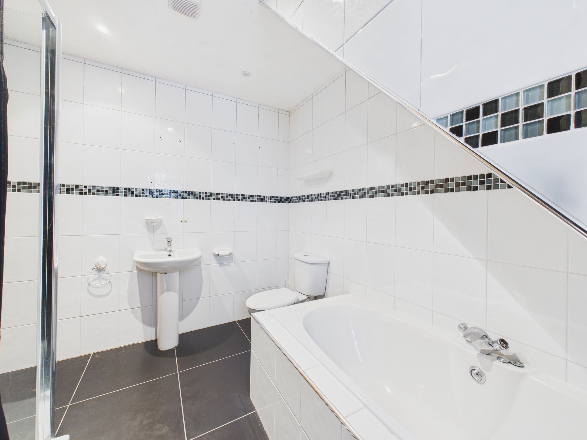 Internal glass brick window to rear. Fitted with matching suite comprising double ended bath with mixer tap, WC and pedestal wash hand basin. Mains waterfall shower in separate glazed enclosure. Fully tiled walls and floor. Heated towel rail.