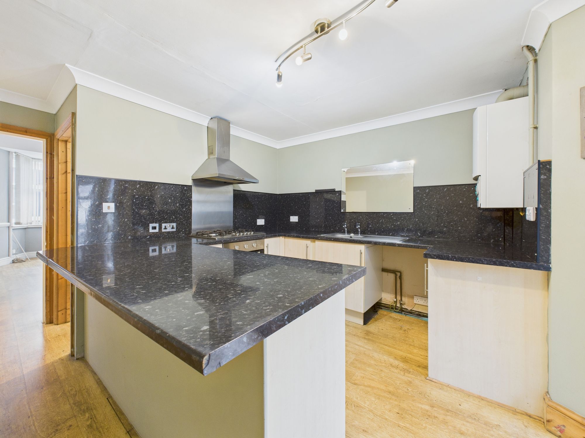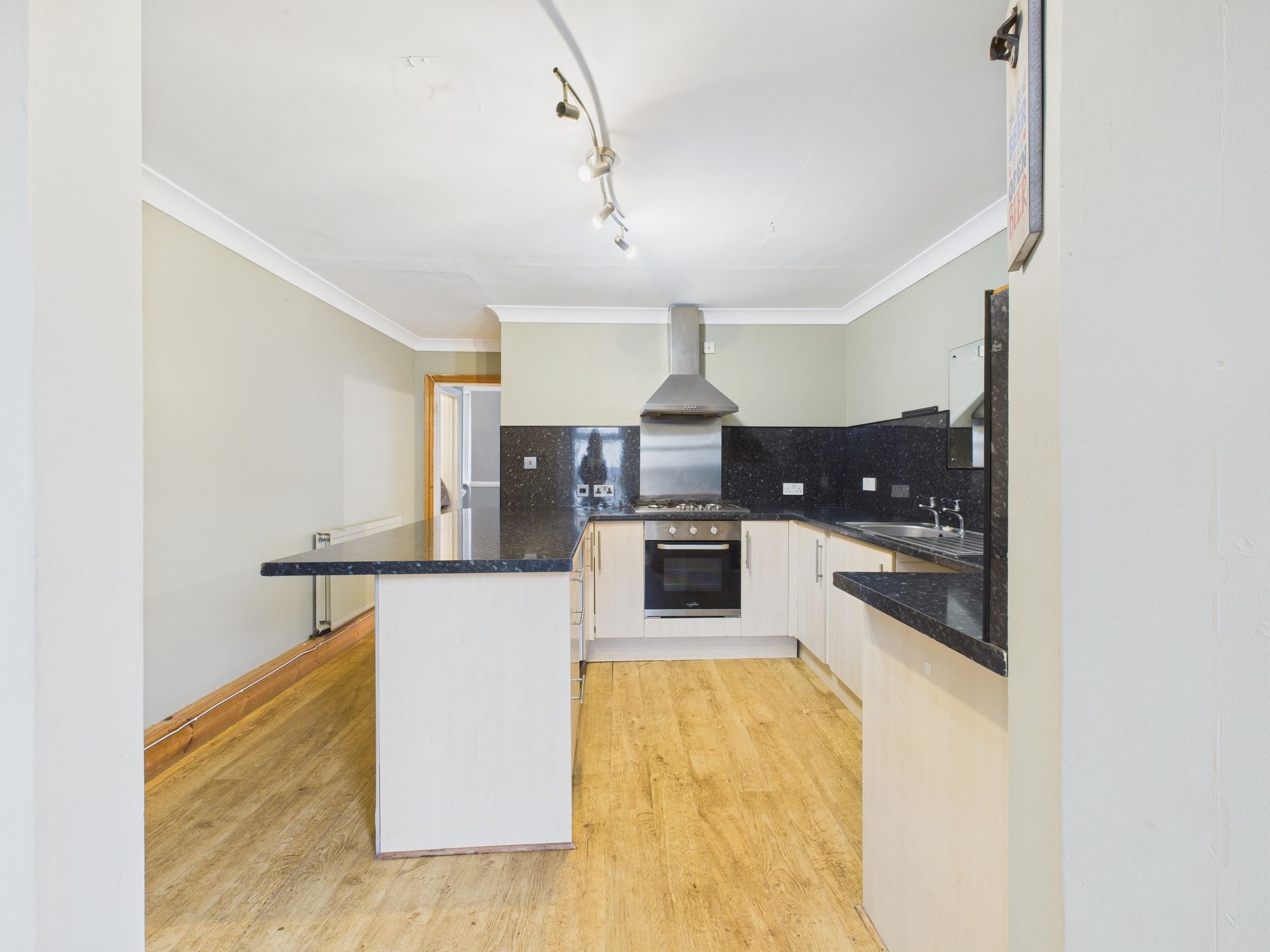 Fitted with a range of base units with granite effect splashback and worktop extending to breakfast bar with space for two seats . Wall mounted Vaillant gas combi boiler. Integral 5-ring gas hob and electric oven with extractor over. Stainless steel sink and drainer. Space and connection for washing machine and fridge freezer. Glazed door to side. Window to the rear. Steps down to the right to access the Second Reception Room. Door to WC. Wood flooring