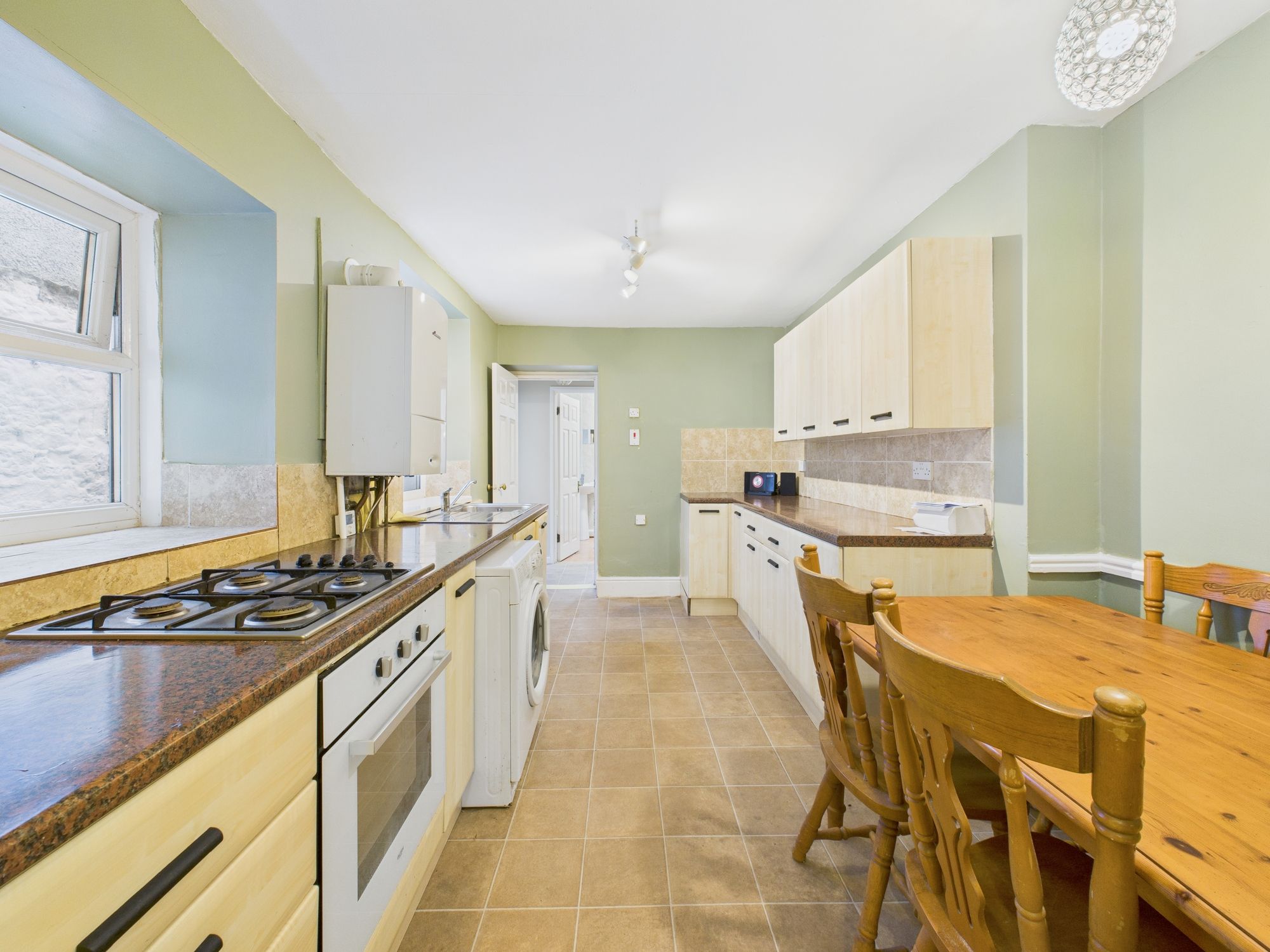 With two double glazed windows to the side. Doors to the Cellar, and to Rear Porch. Wall mounted Worcester gas combi boiler. Fitted with a range of wall and base units with matching worktop. Integrated gas 4-ring hob and electric oven. Inset stainless steel sink and drainer with mixer tap. Space and connection for washing machine. Part tiled walls. Tiled floor. Ample space for family sized dining suite.