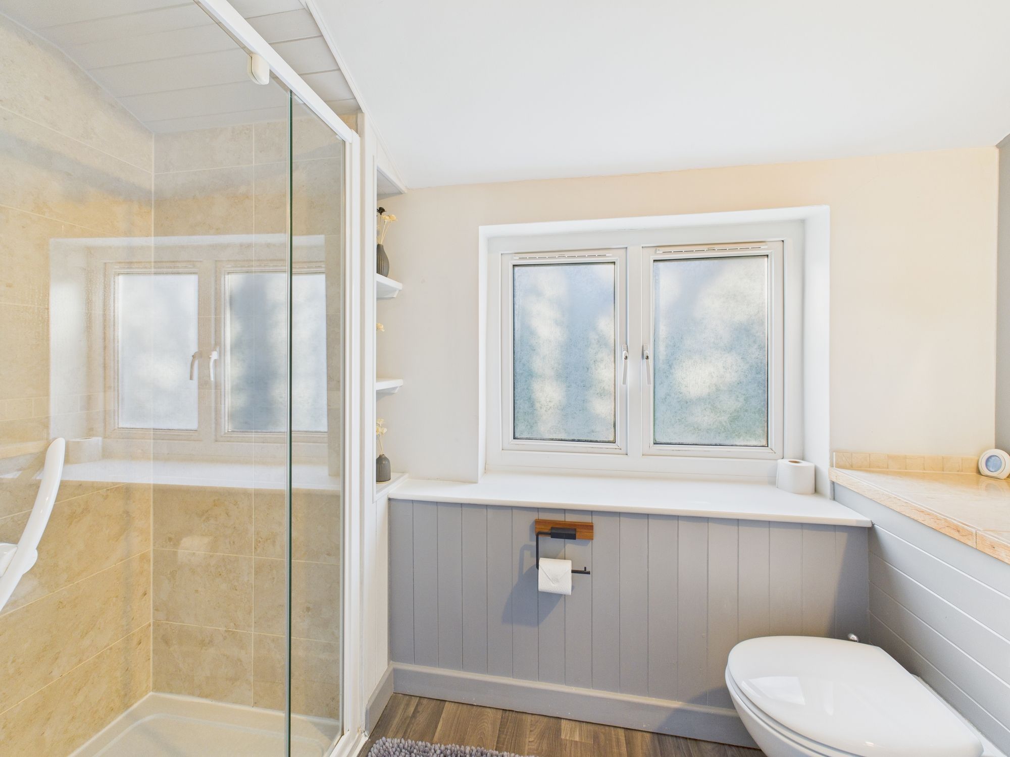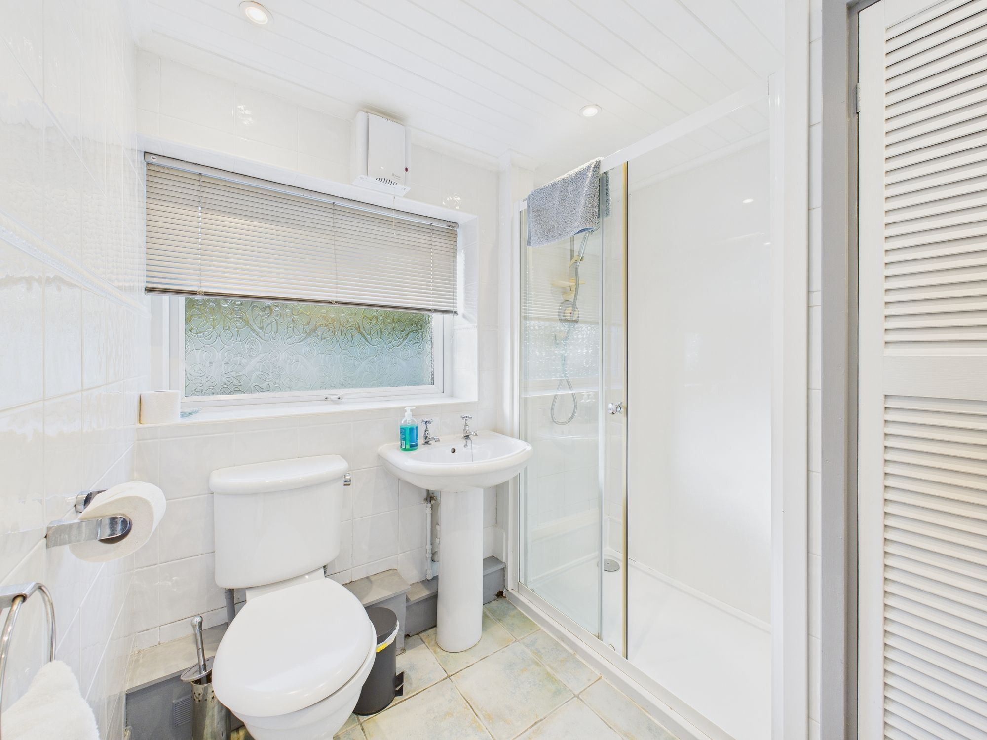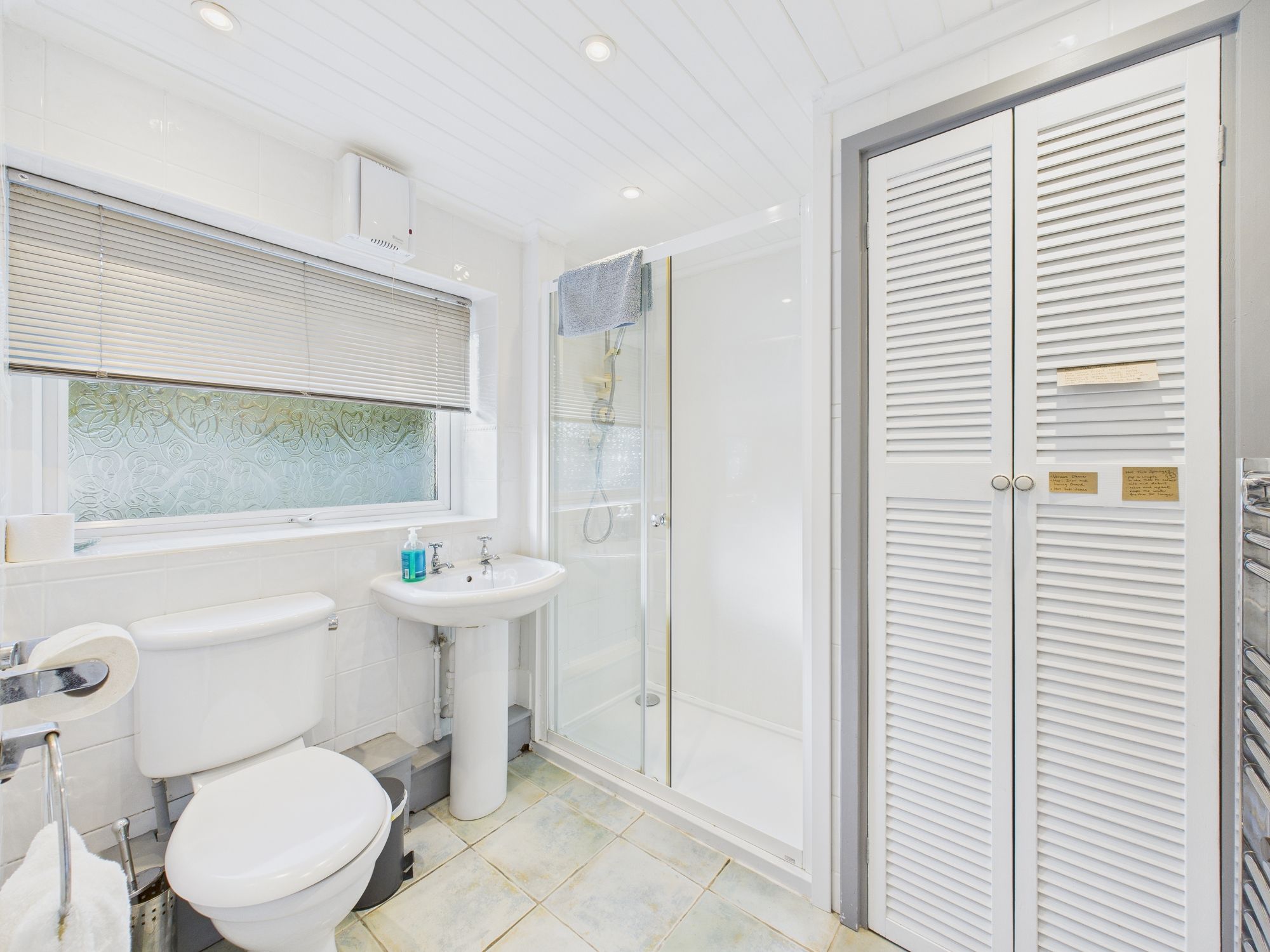Frosted window to rear. Fitted with matching suite comprising WC, pedestal wash hand basin and mains shower in level access enclosure. Double door to large airing cupboard.