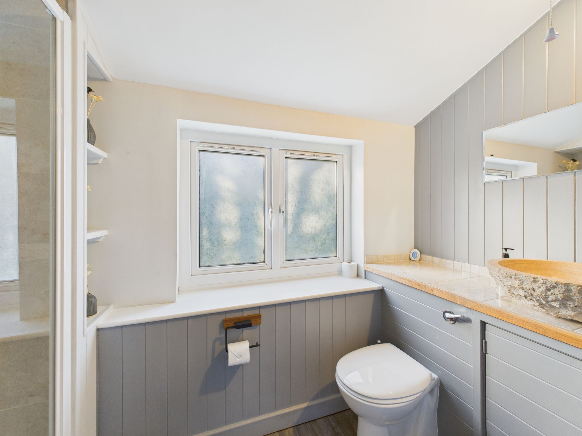 Window to rear and internal obscured window to the Landing. Fitted with matching suite comprising WC, stone wash hand basin, and mains shower in level access glazed enclosure. Part tiled walls. Vinyl flooring.