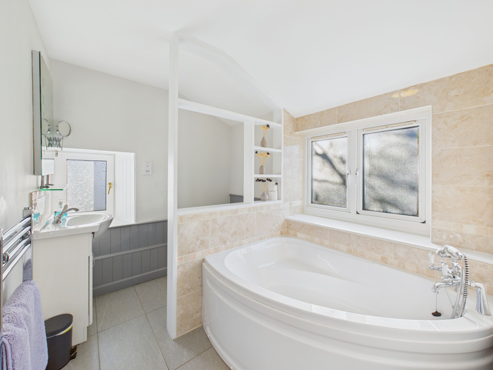 Double aspect with windows to side and rear. Fitted with matching suite comprising WC, wash hand basin and corner bathtub. Part tiled walls. Laminate floor. Heated towel rail.