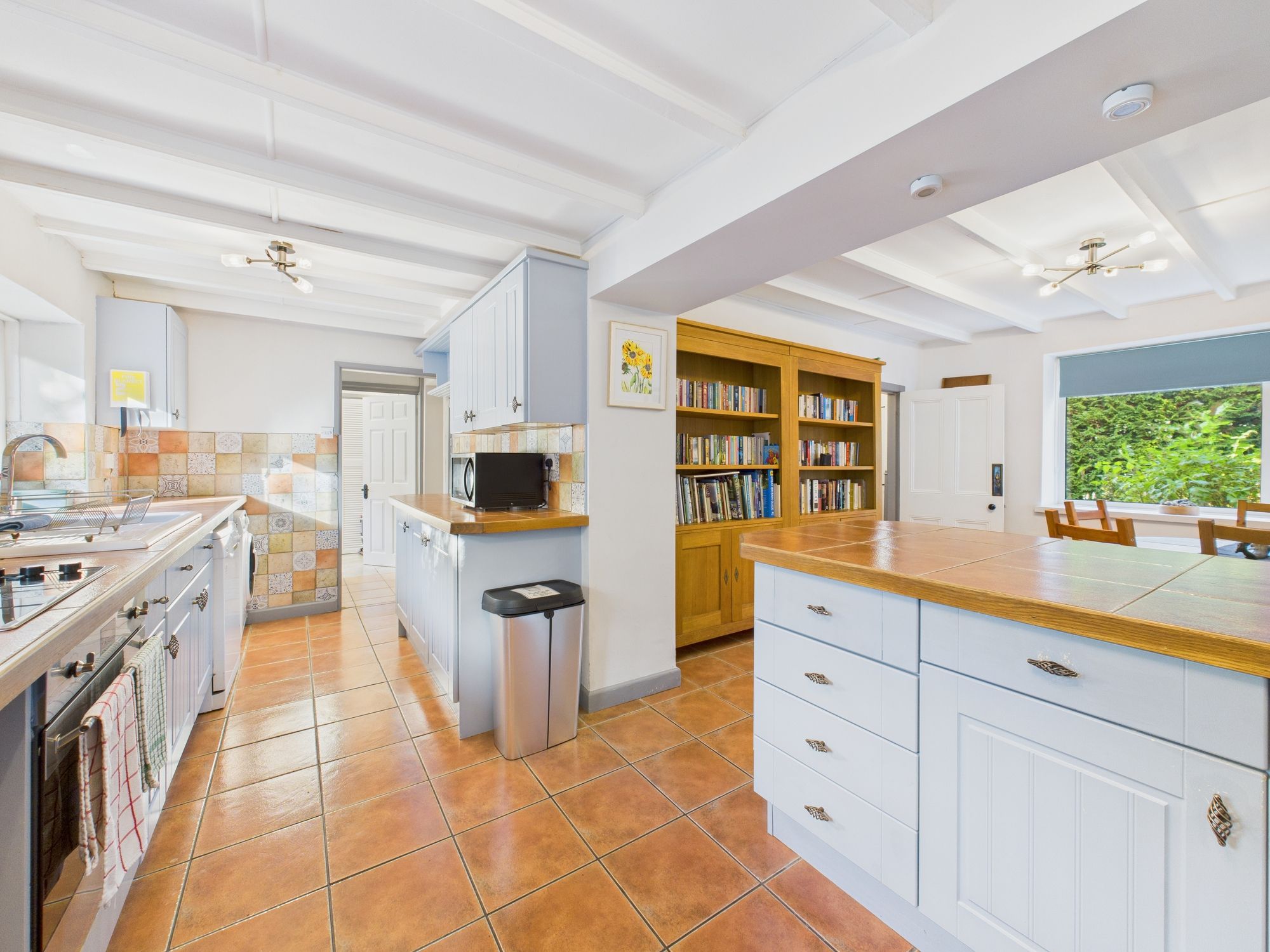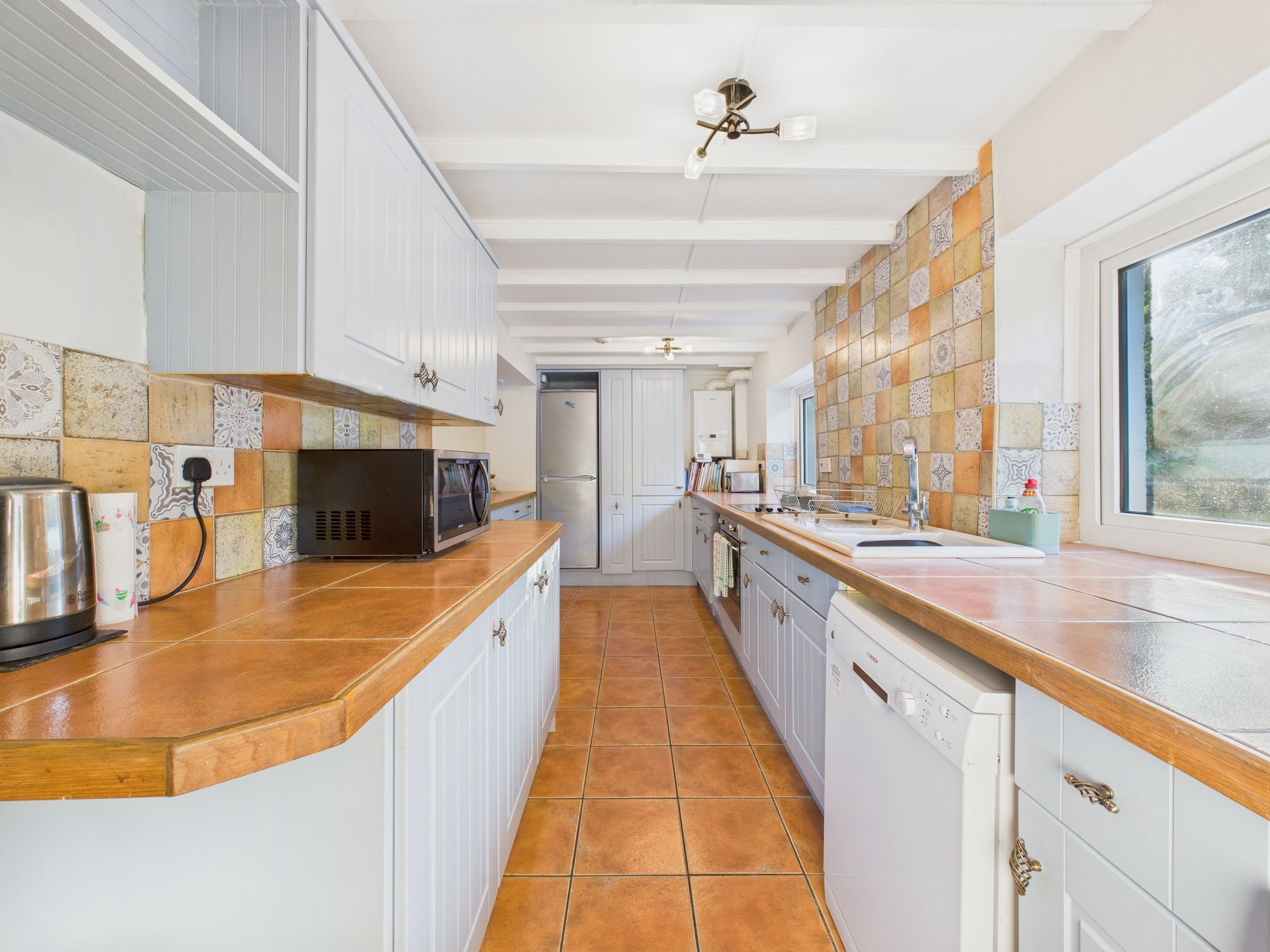 L shape room. One window to front and two to rear. Doorway to Rear Hall. The Kitchen is fitted with a range of wall and base units with matching tiled worktop extending to breakfast bar. Integral four ring electric hob and oven. Space and connection for fridge freezer and under counter washing machine and dishwasher. Wall mounted Ideal gas combi boiler. Inset ceramic sink and drainer with filtered mixer tap over. Ample space for family sized dining suite. Part tiled walls and tiled floor.