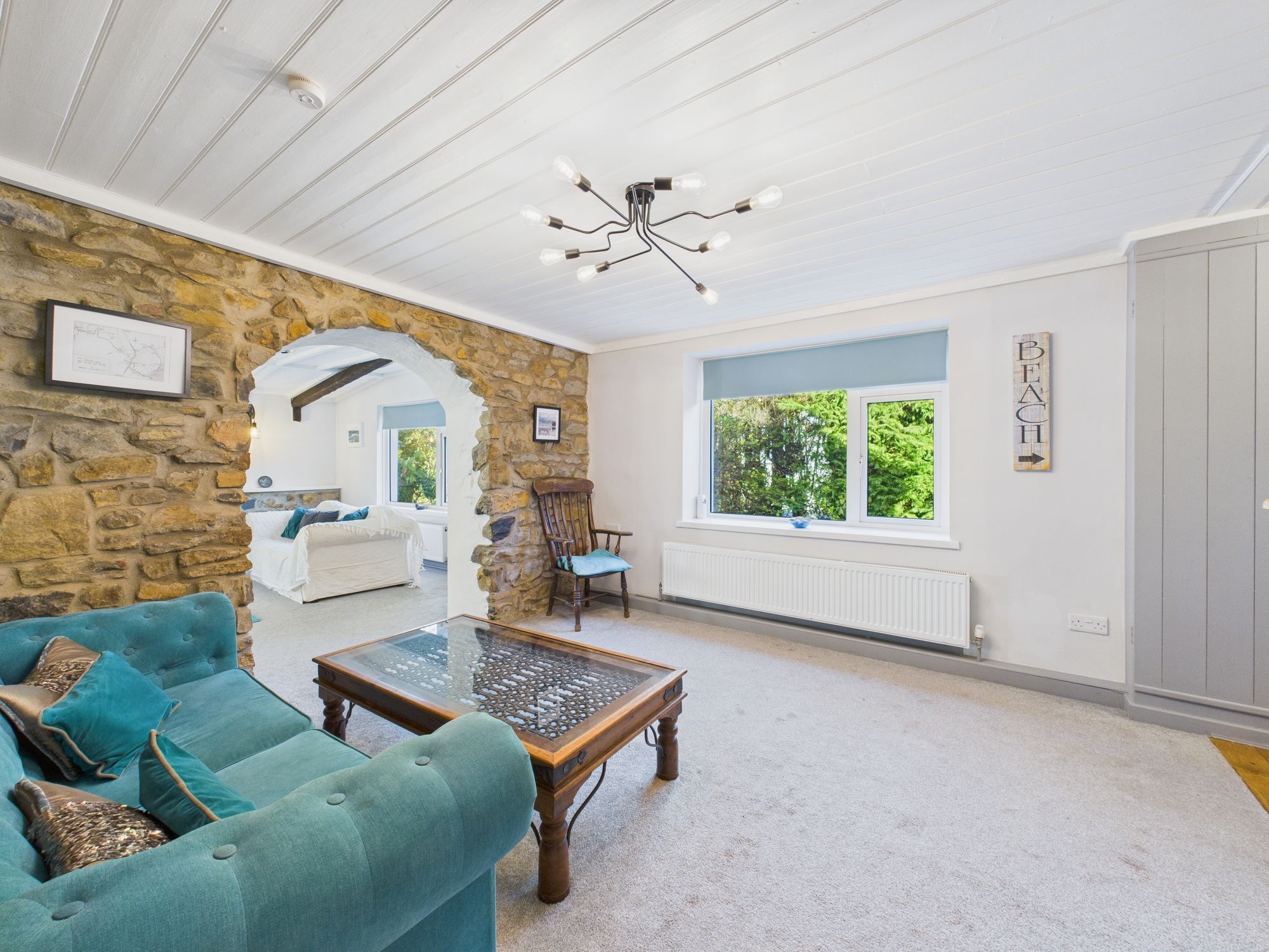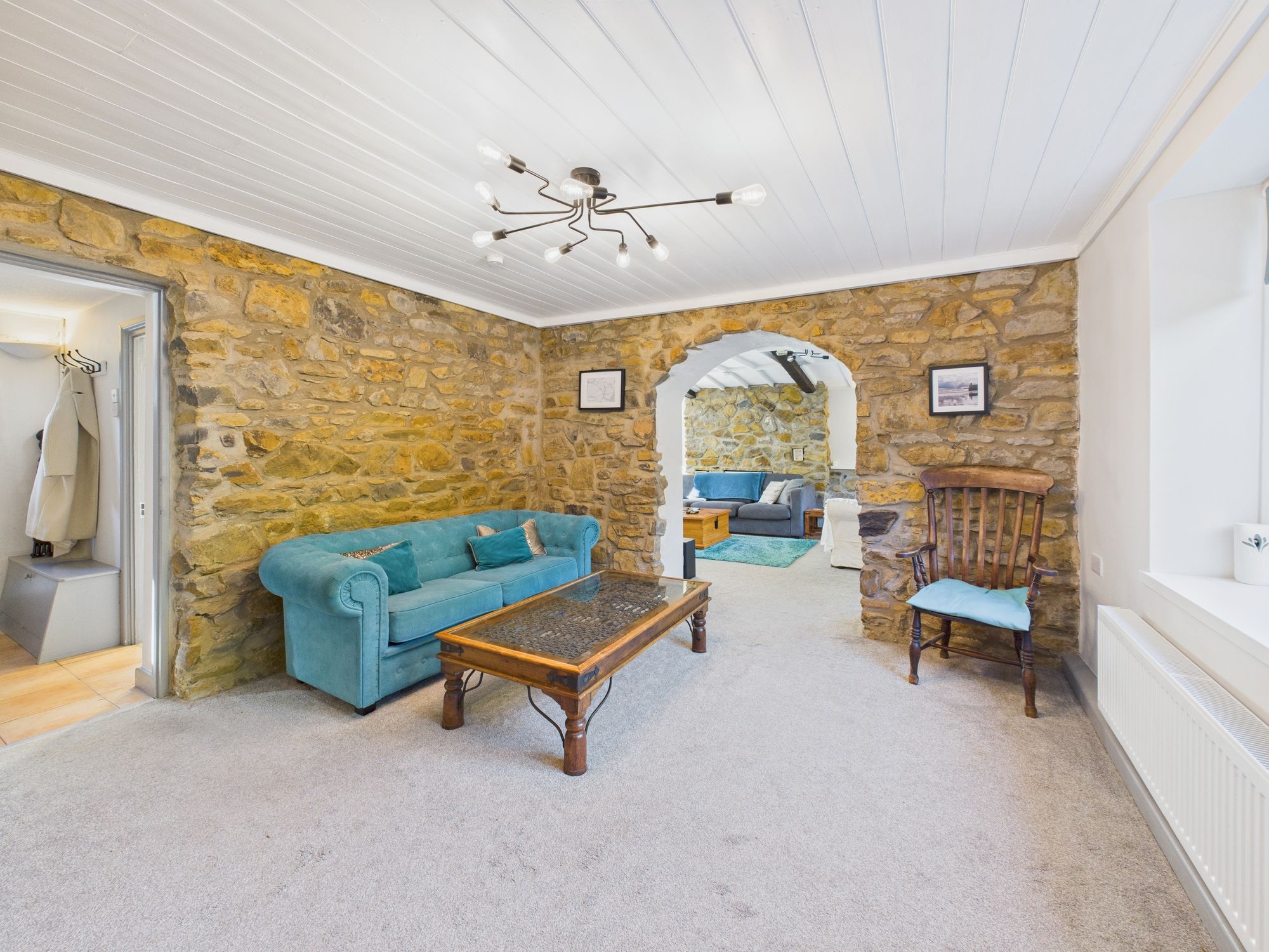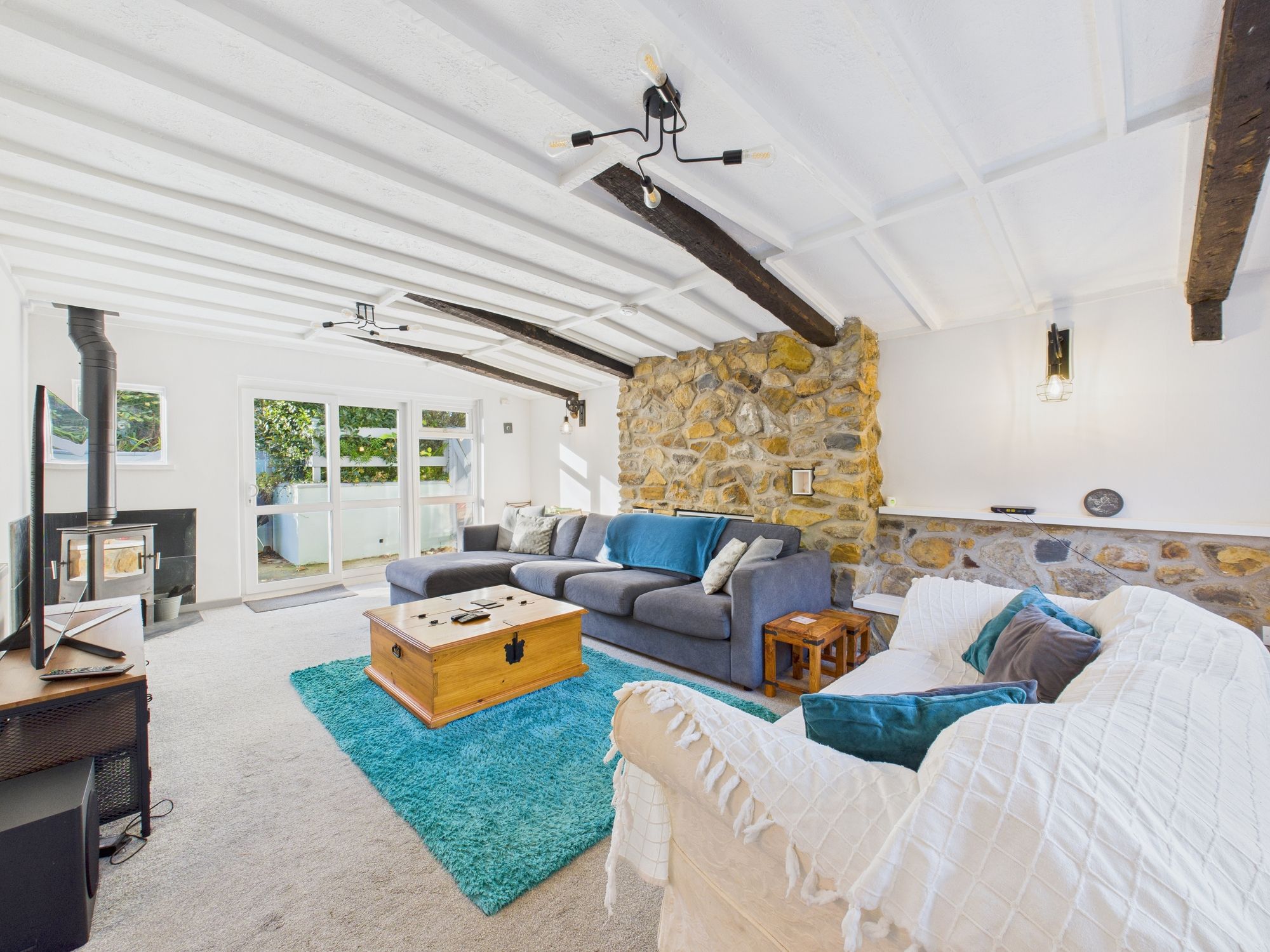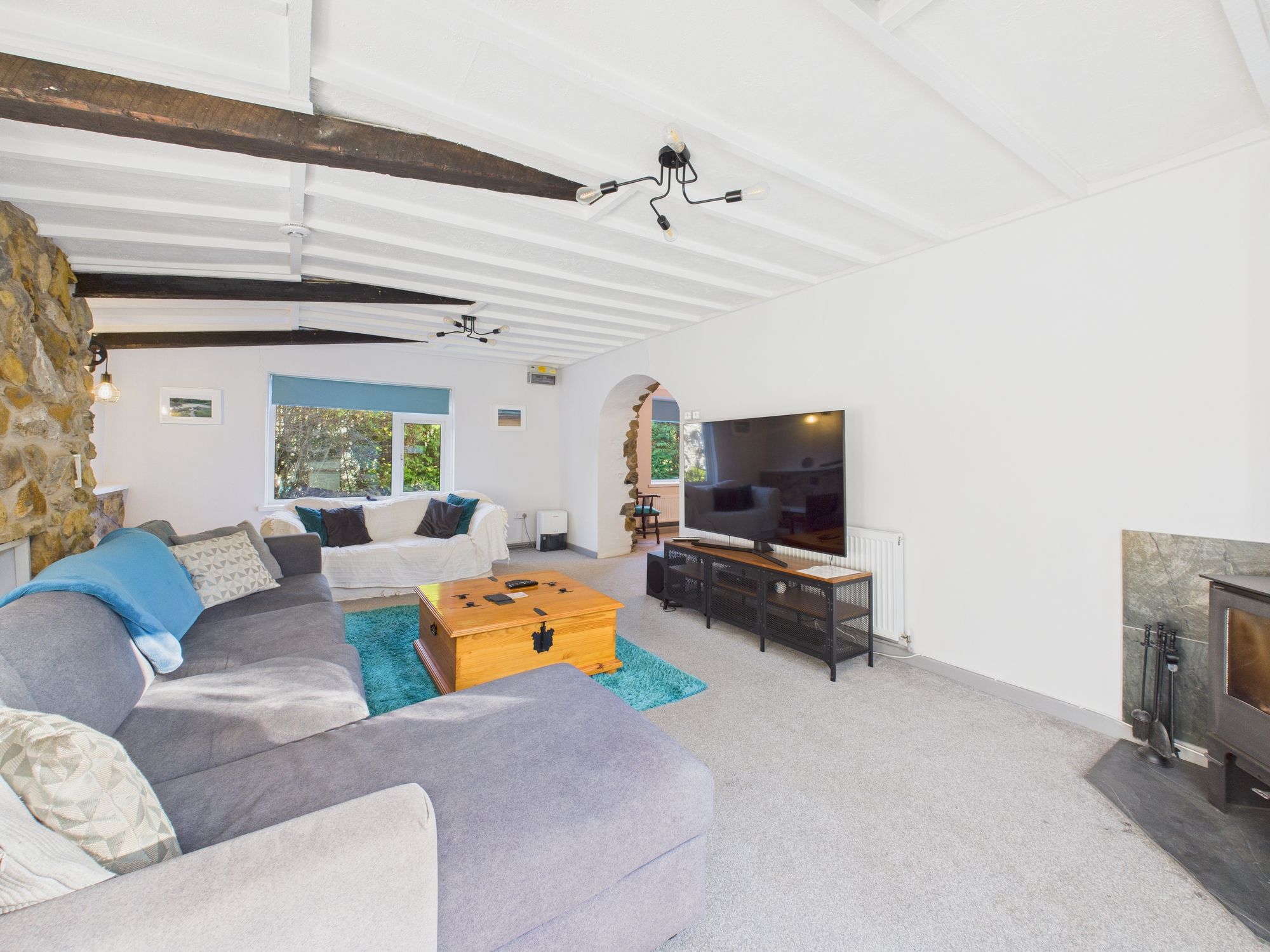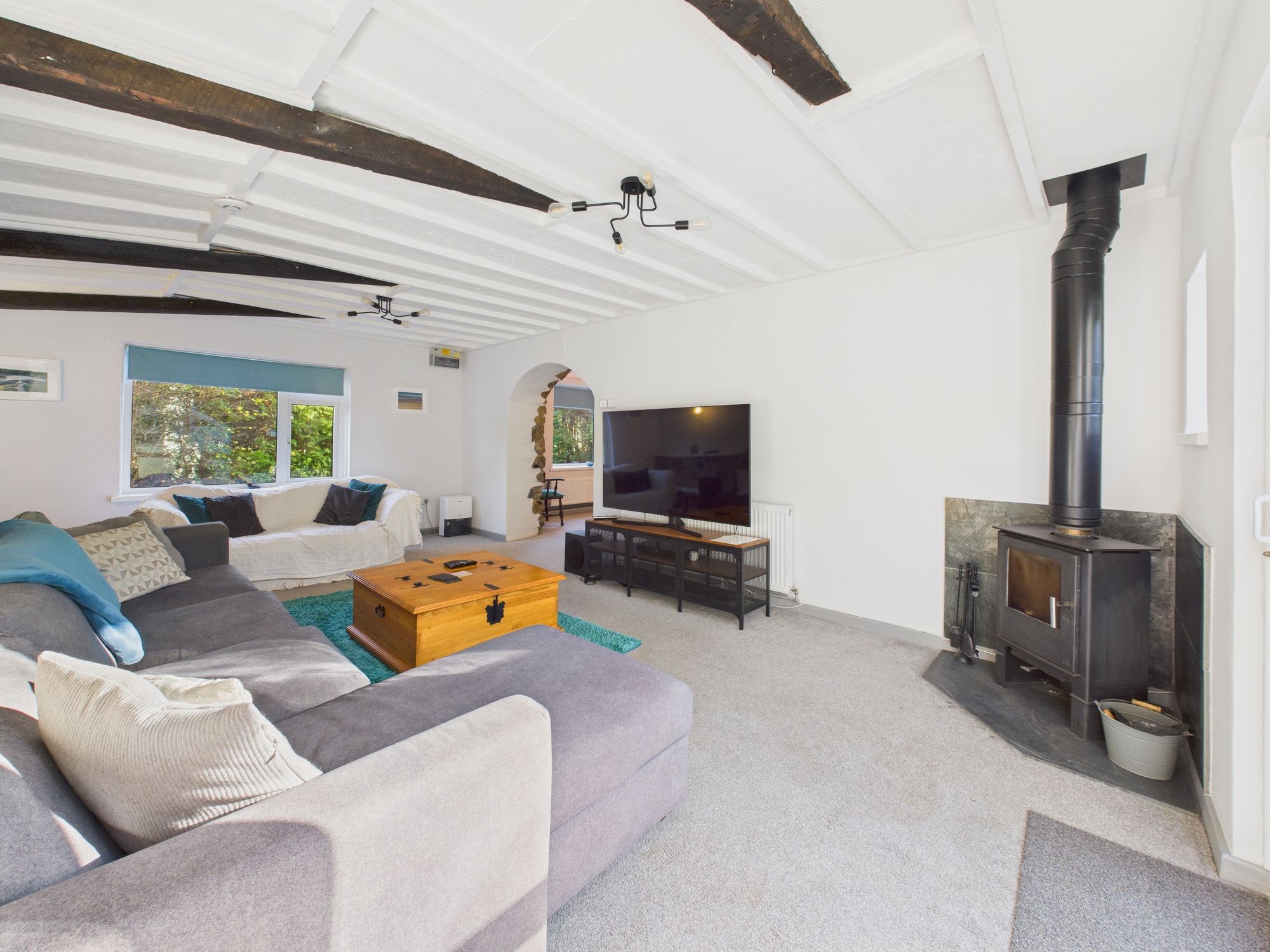 Window to front. Sliding glazed doors and window to rear. Log burner with slate hearth and tiled surround.